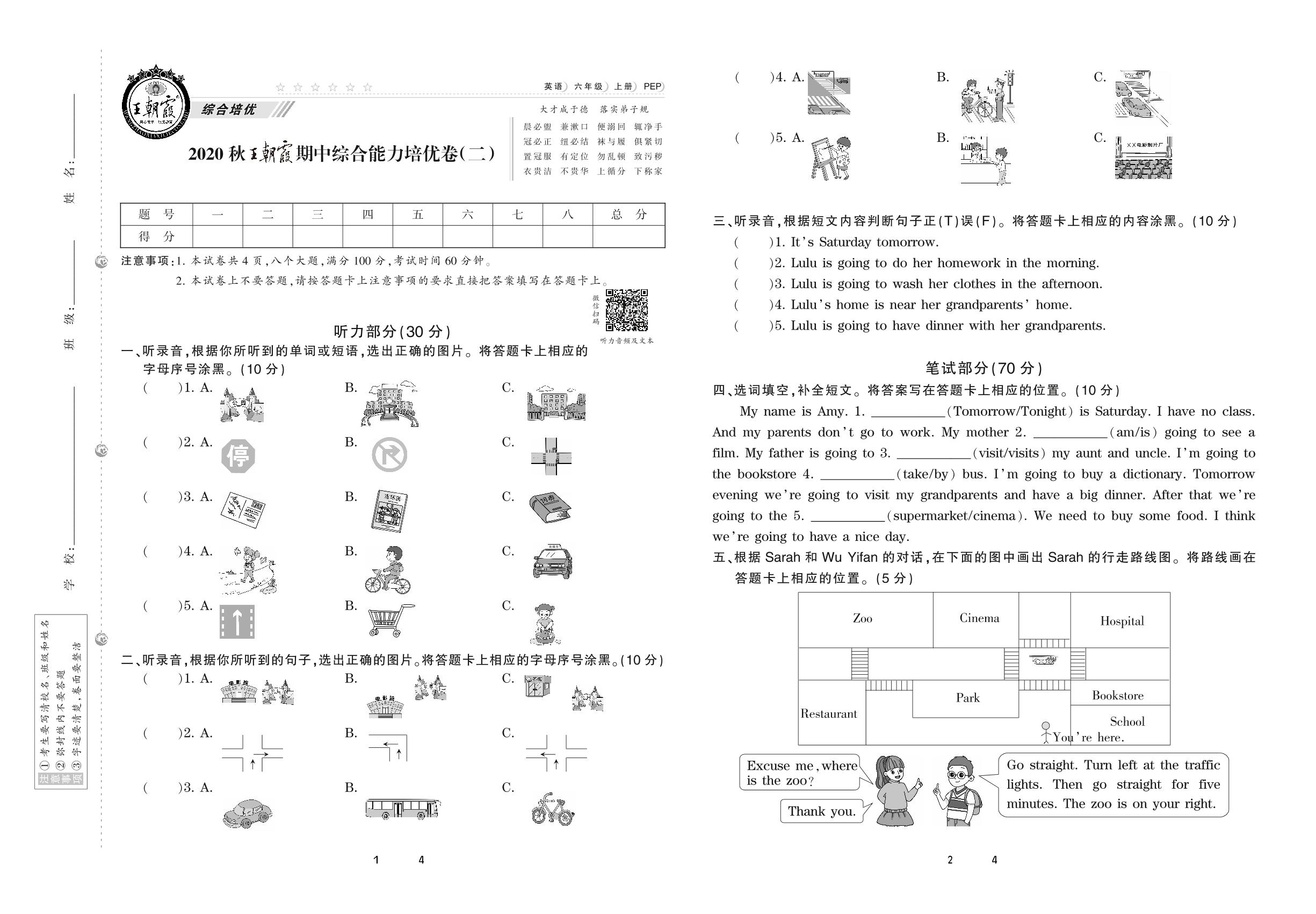 2020上册六年级英语PEP版 王朝霞期中综合能力培优卷(二)