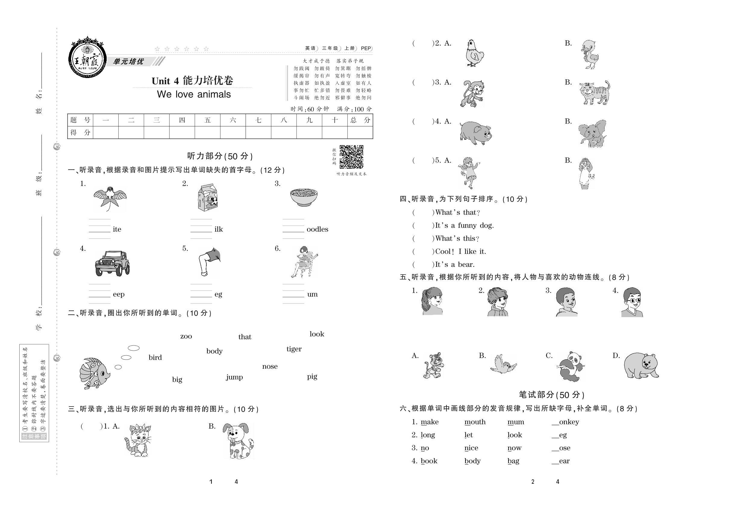 2020上册三年级英语PEP版 Unit 4 能力培优卷