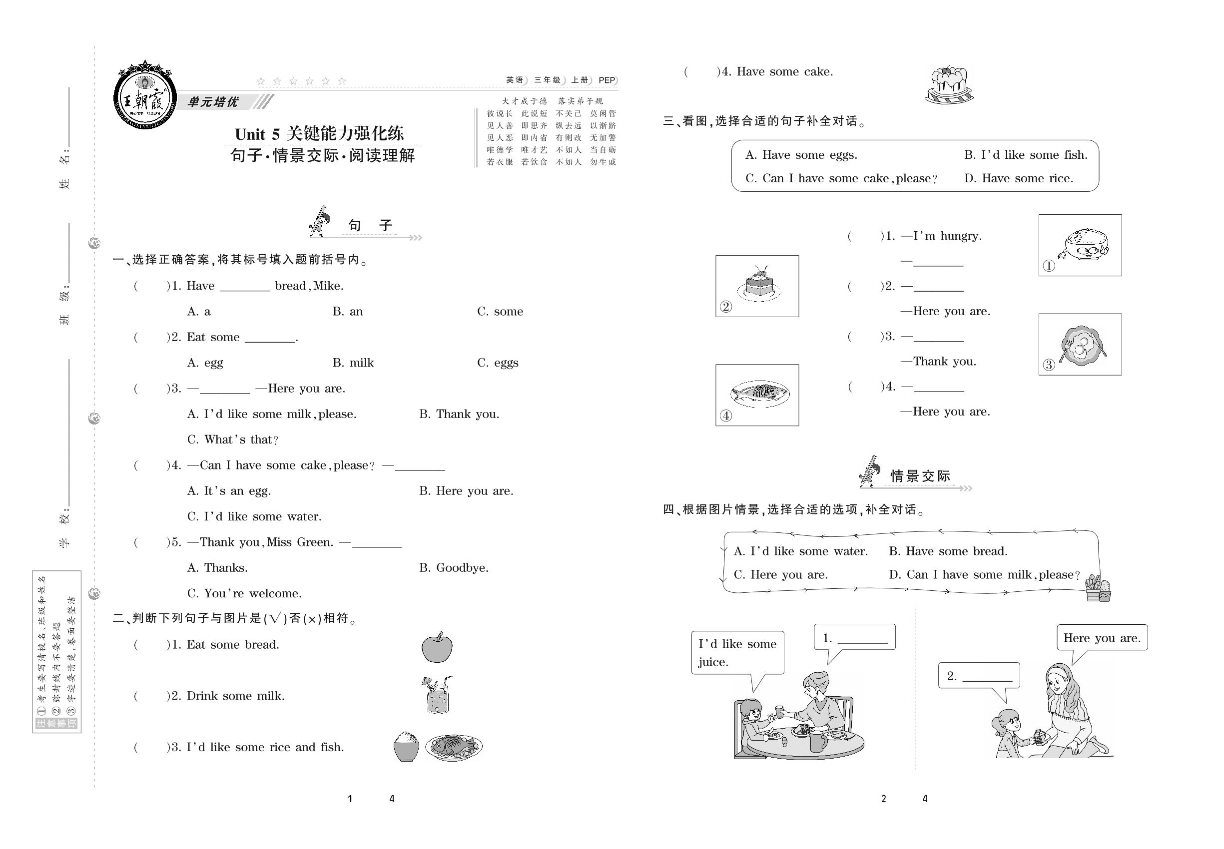 2020上册三年级英语PEP版 Unit 5 关键能力强化练