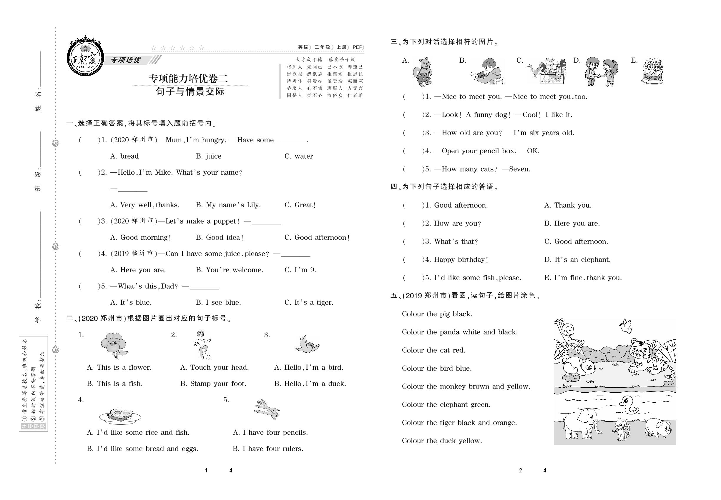 2020上册三年级英语PEP版 专项能力培优卷二 句子与情景交际