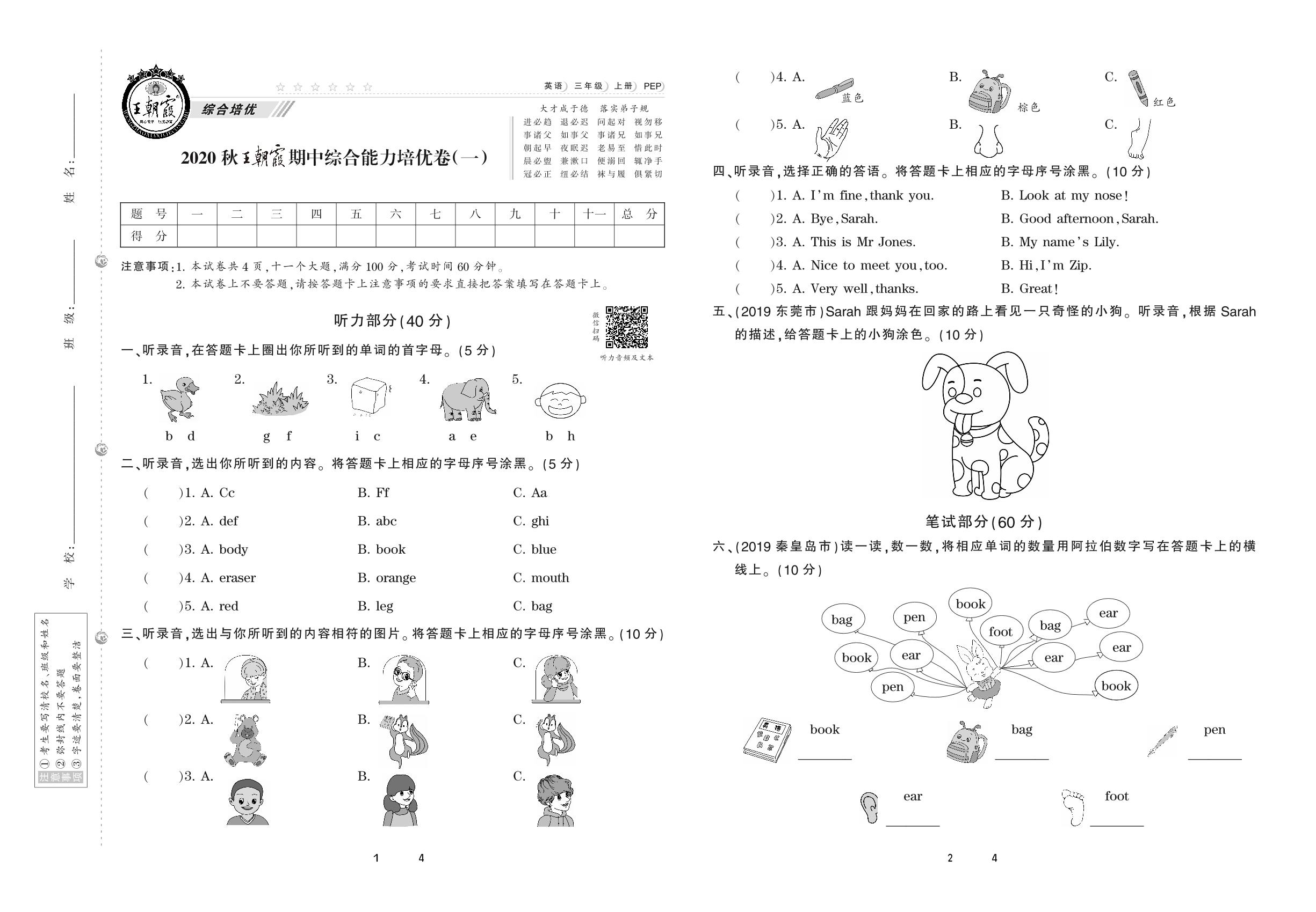 2020上册三年级英语PEP版 王朝霞期中综合能力培优卷(一)