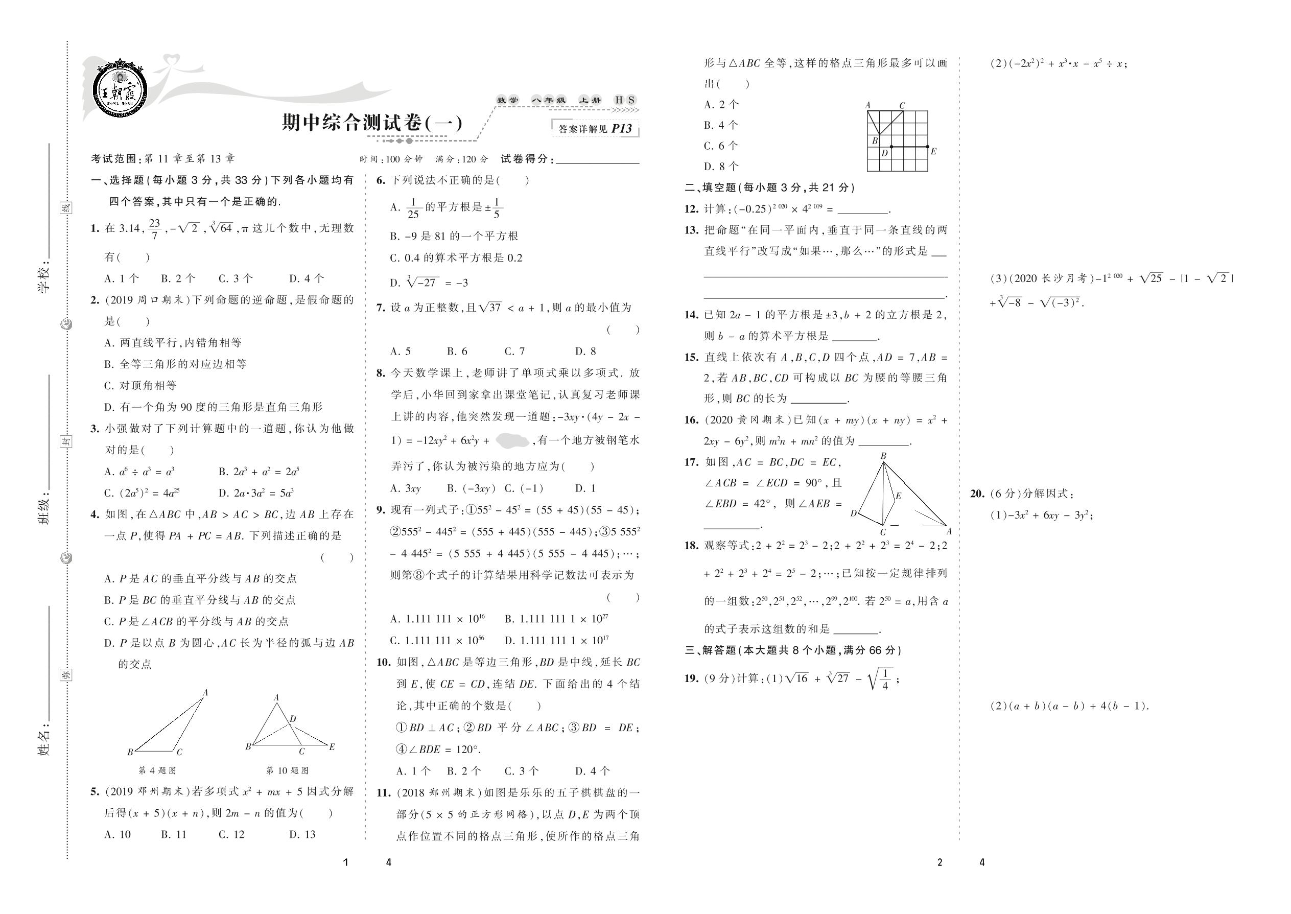 2020上册八年级数学华师版 期中综合测试卷(一)
