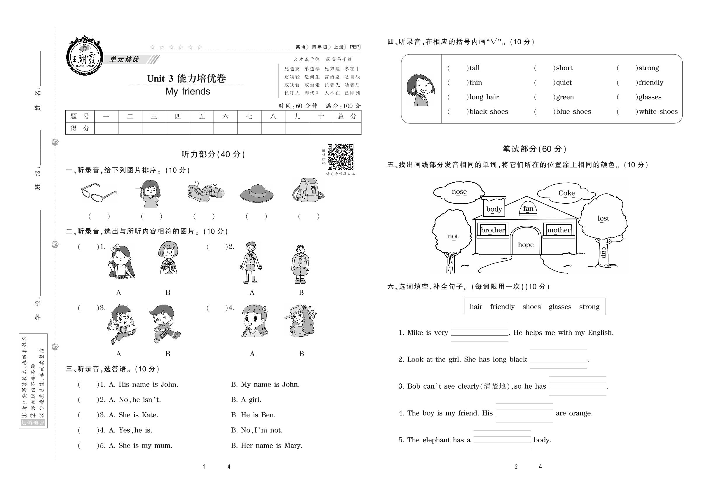2020上册四年级英语PEP版 Unit 3 能力培优卷