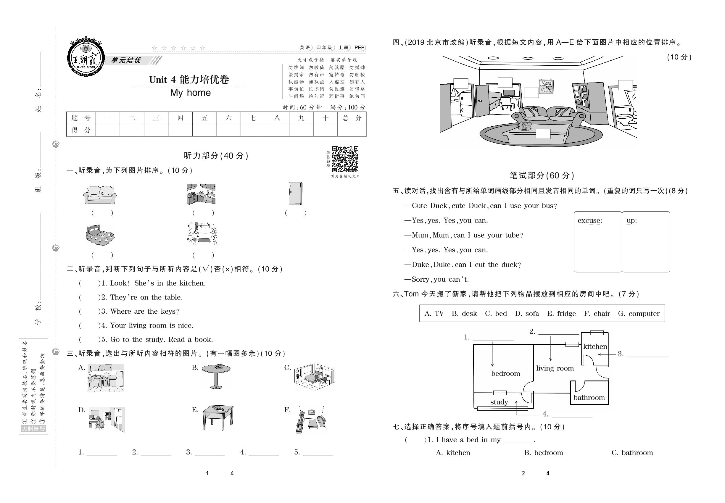 四年级英语人教PEP版(三起始)上册单元卷