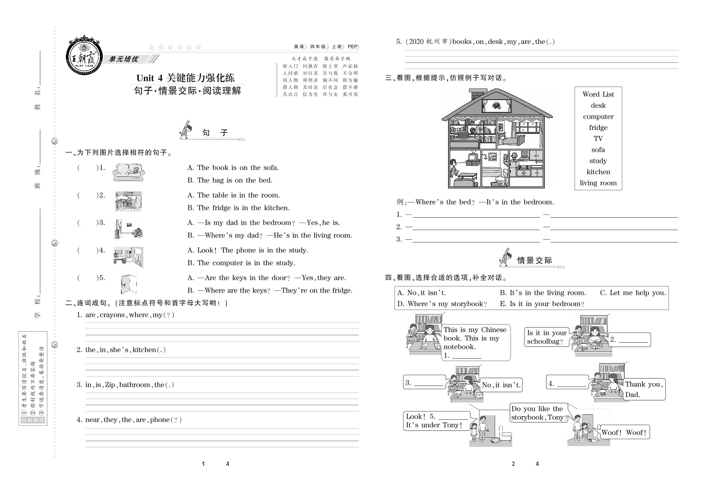 2020上册四年级英语PEP版 Unit 4 关键能力强化练