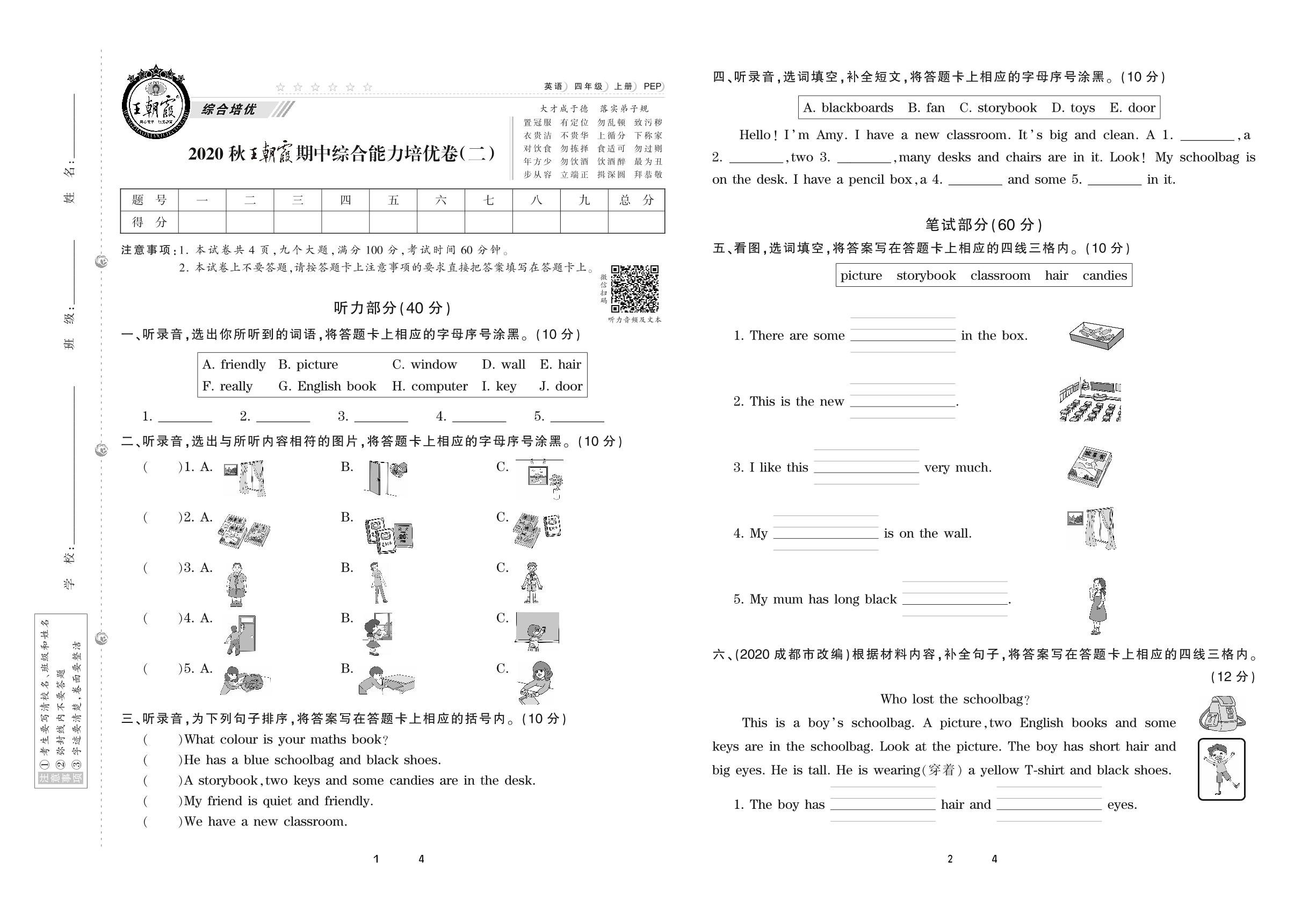 2020上册四年级英语PEP版 王朝霞期中综合能力培优卷(二)