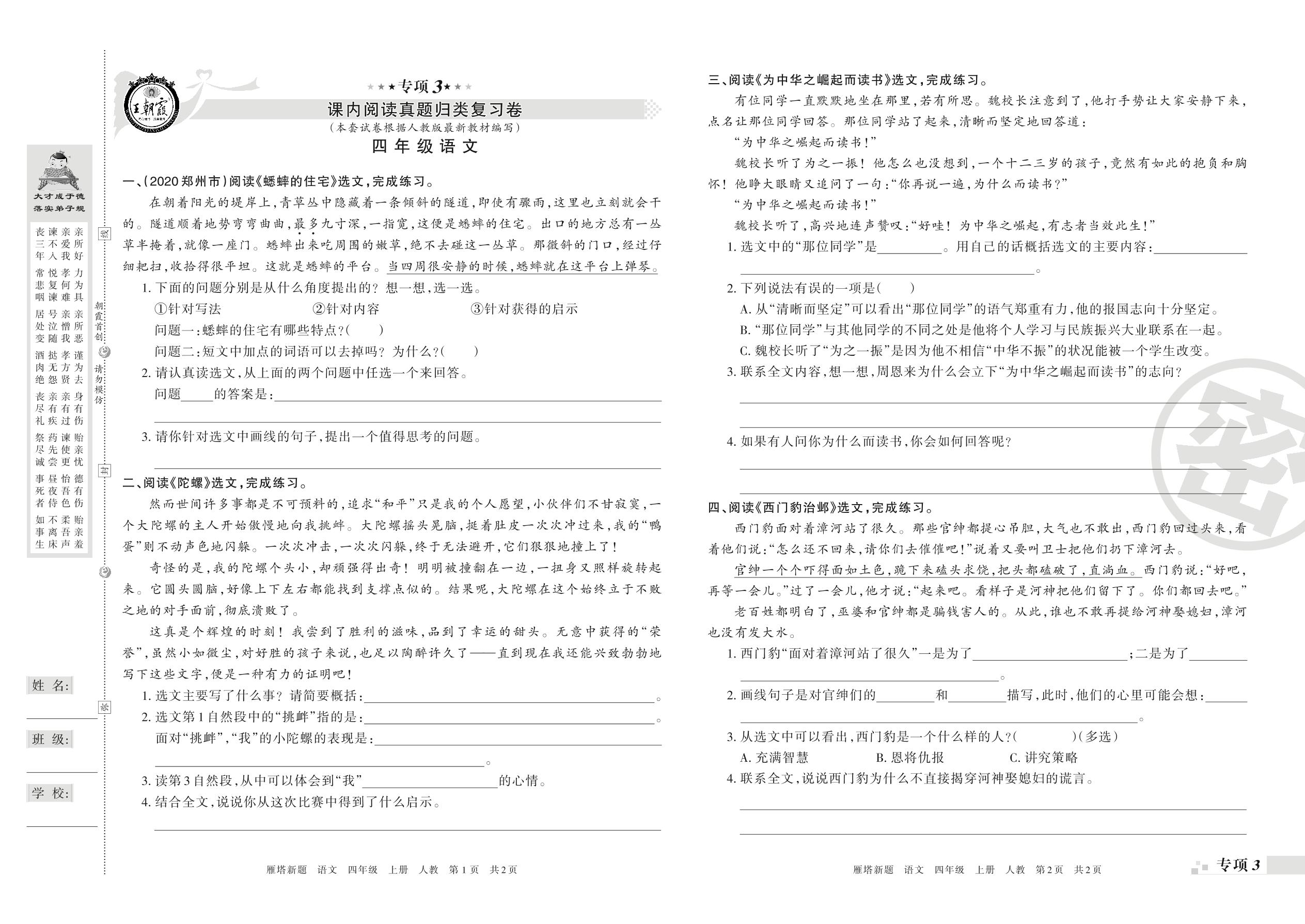 王朝霞期末专项卷——课内阅读、课外阅读真题归类复习四年级上册语文(人教版)_R210801183805【0】
