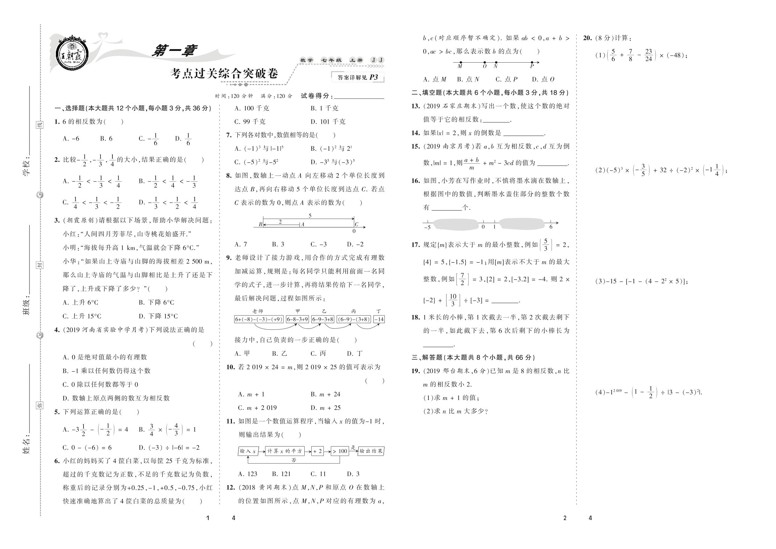 2020上册七年级数学冀教版 第一章 考点过关综合突破卷