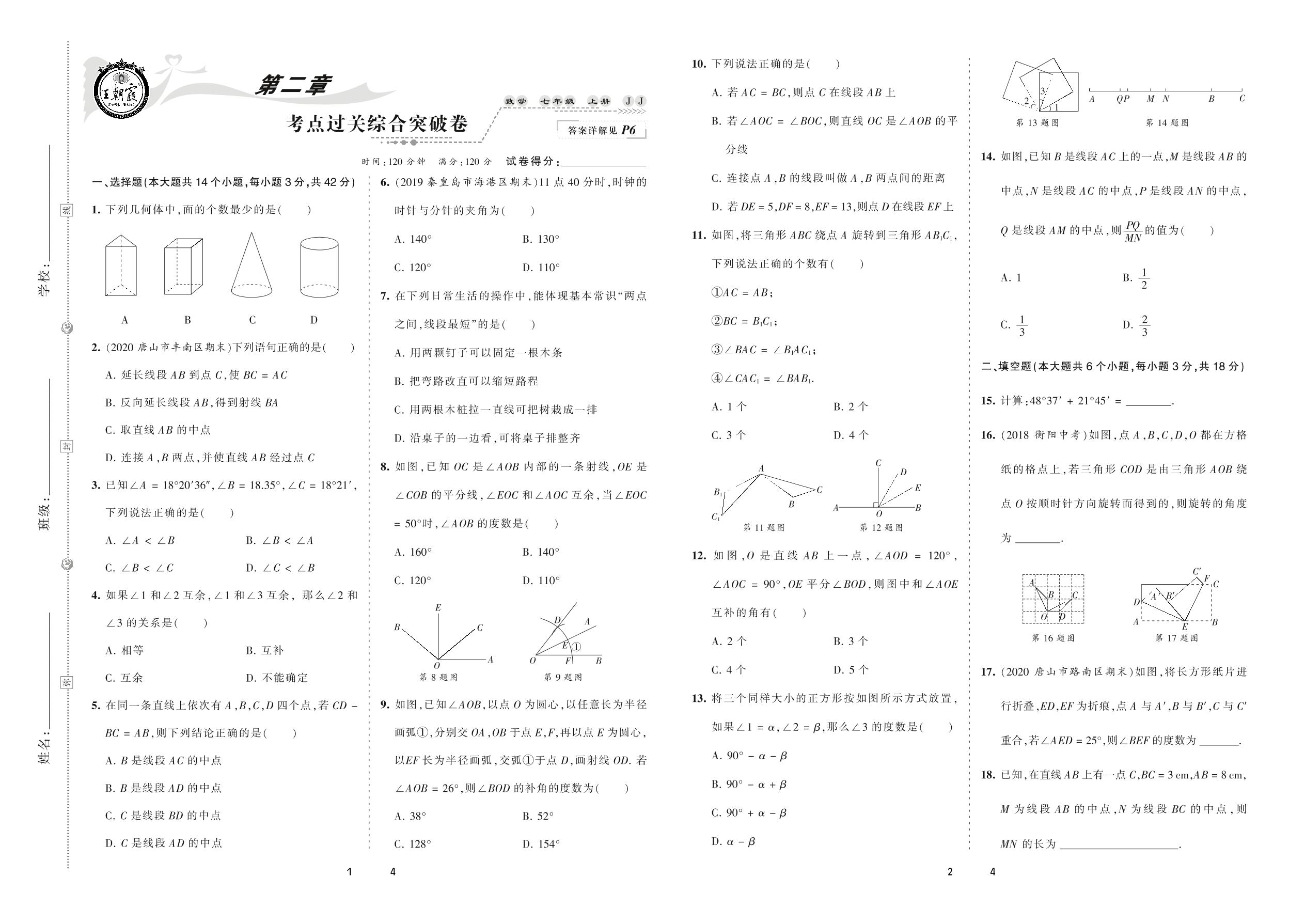 2020上册七年级数学冀教版 第二章 考点过关综合突破卷