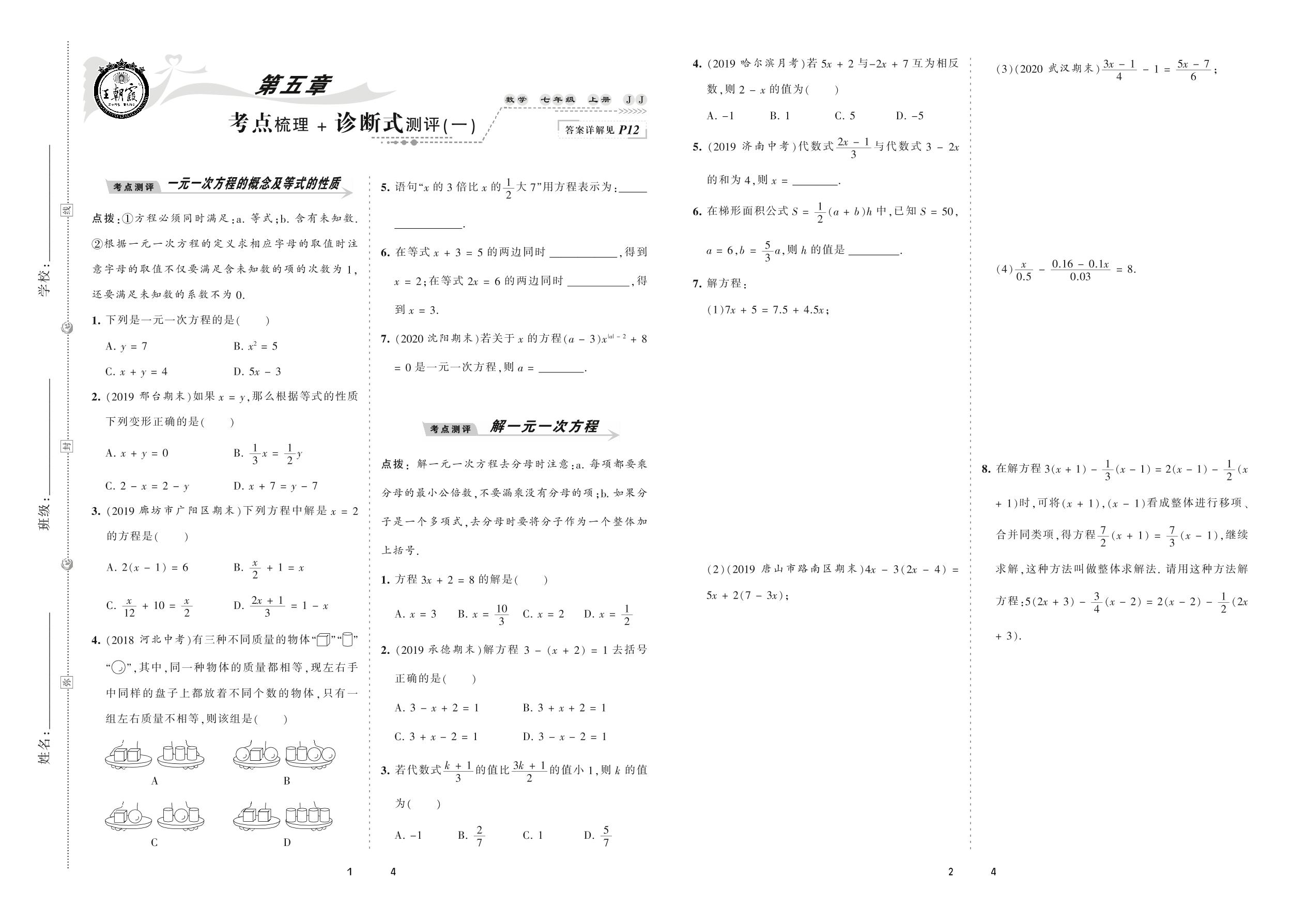 2020上册七年级数学冀教版 第五章 考点梳理 + 诊断式测评(一)