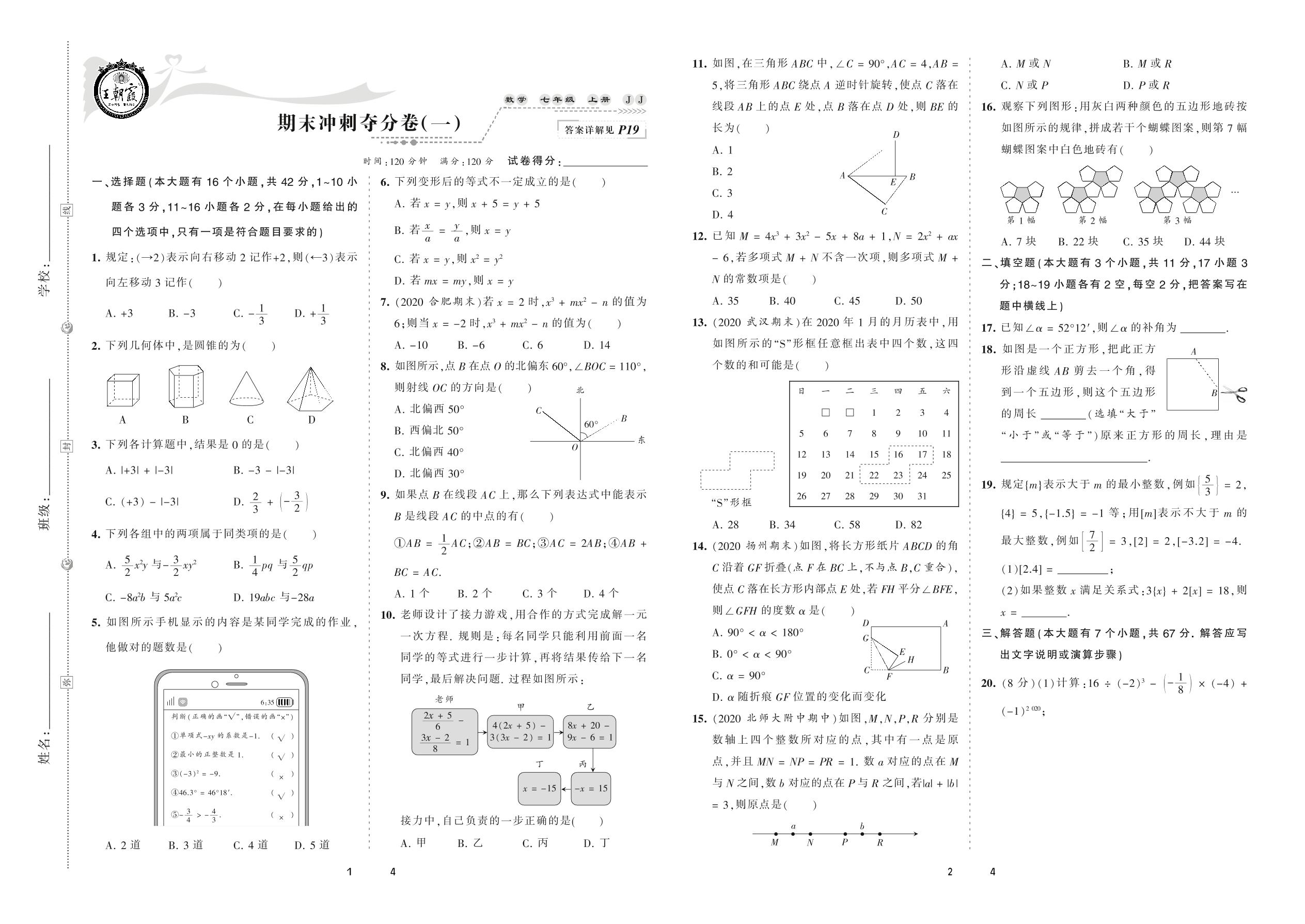 2020上册七年级数学冀教版 期末冲刺夺分卷(一)