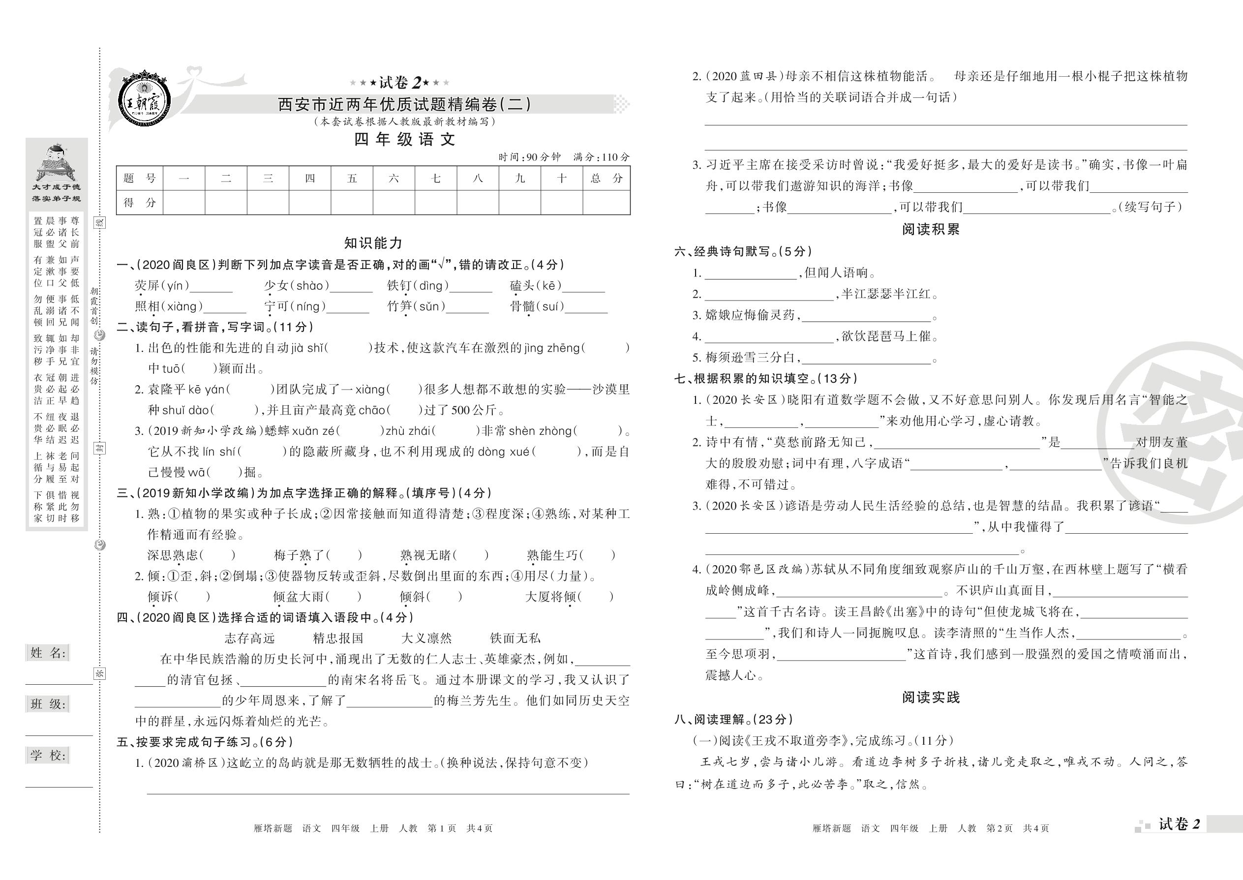 西安市近两年优质试题精编卷(二)四年级上册语文(人教版)【2】