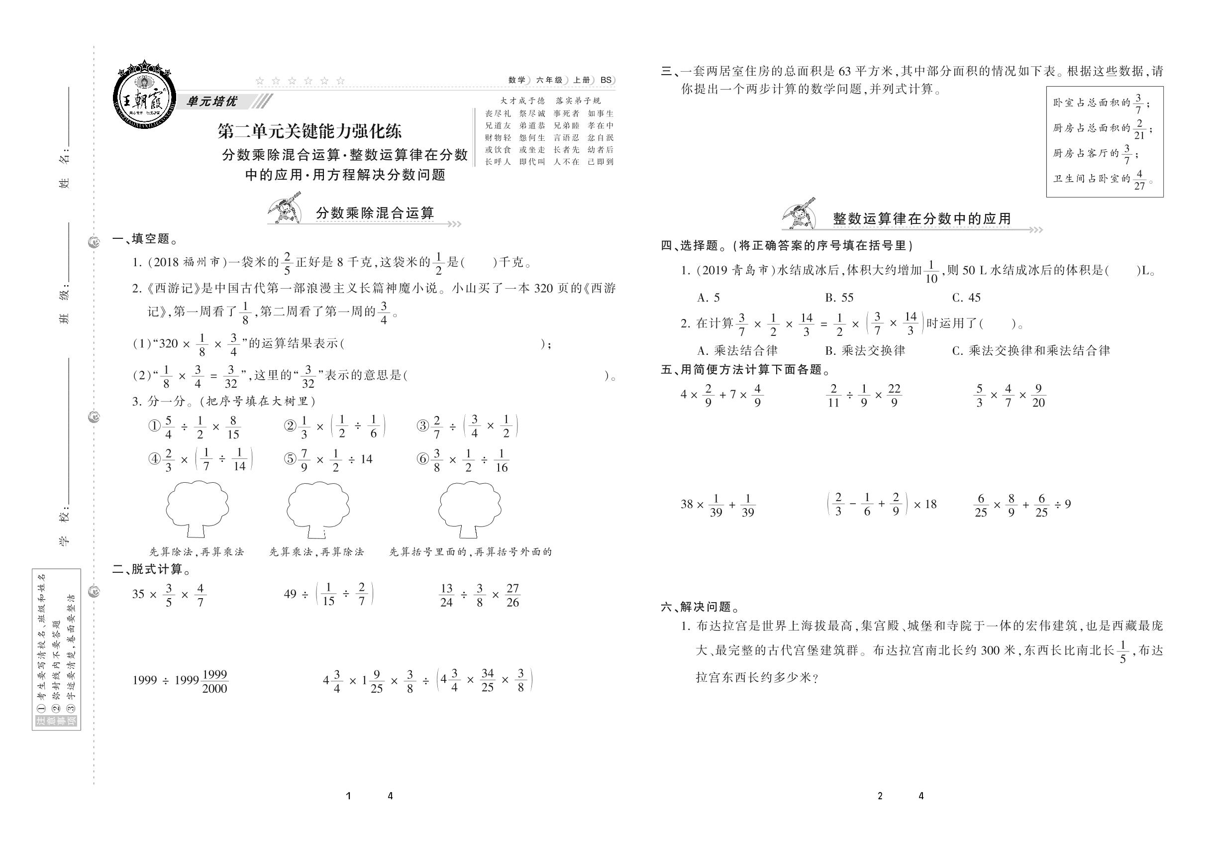2020上册六年级数学北师版 第二单元 关键能力强化练
