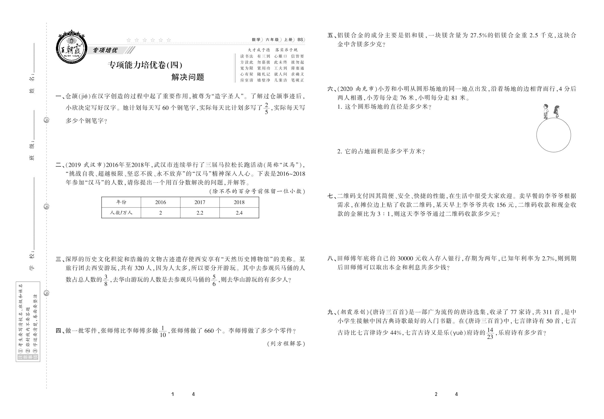 2020上册六年级数学北师版 专项能力培优卷(四) 解决问题