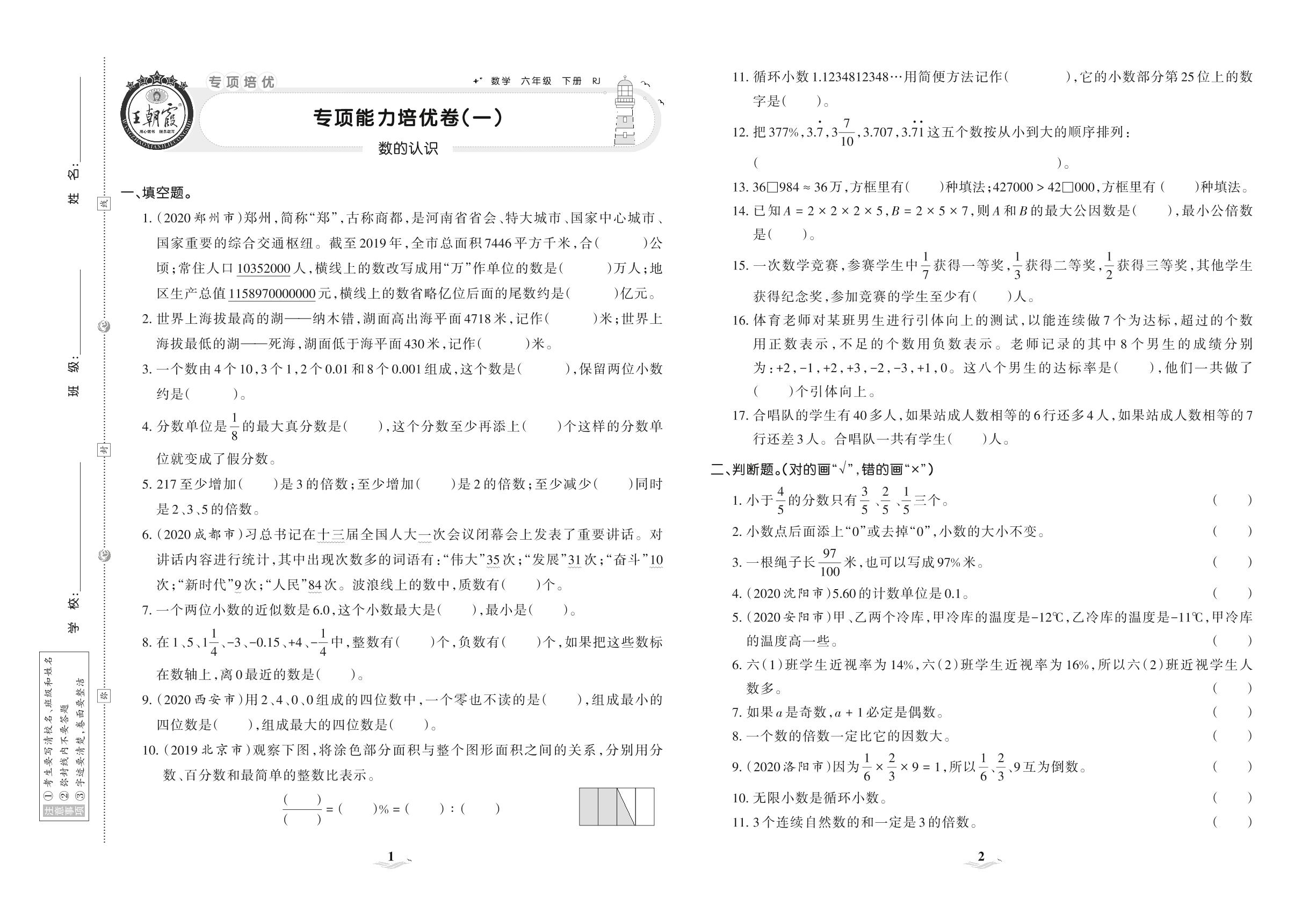 2021下册六年级数学人教版 专项能力培优卷(一) 数的认识