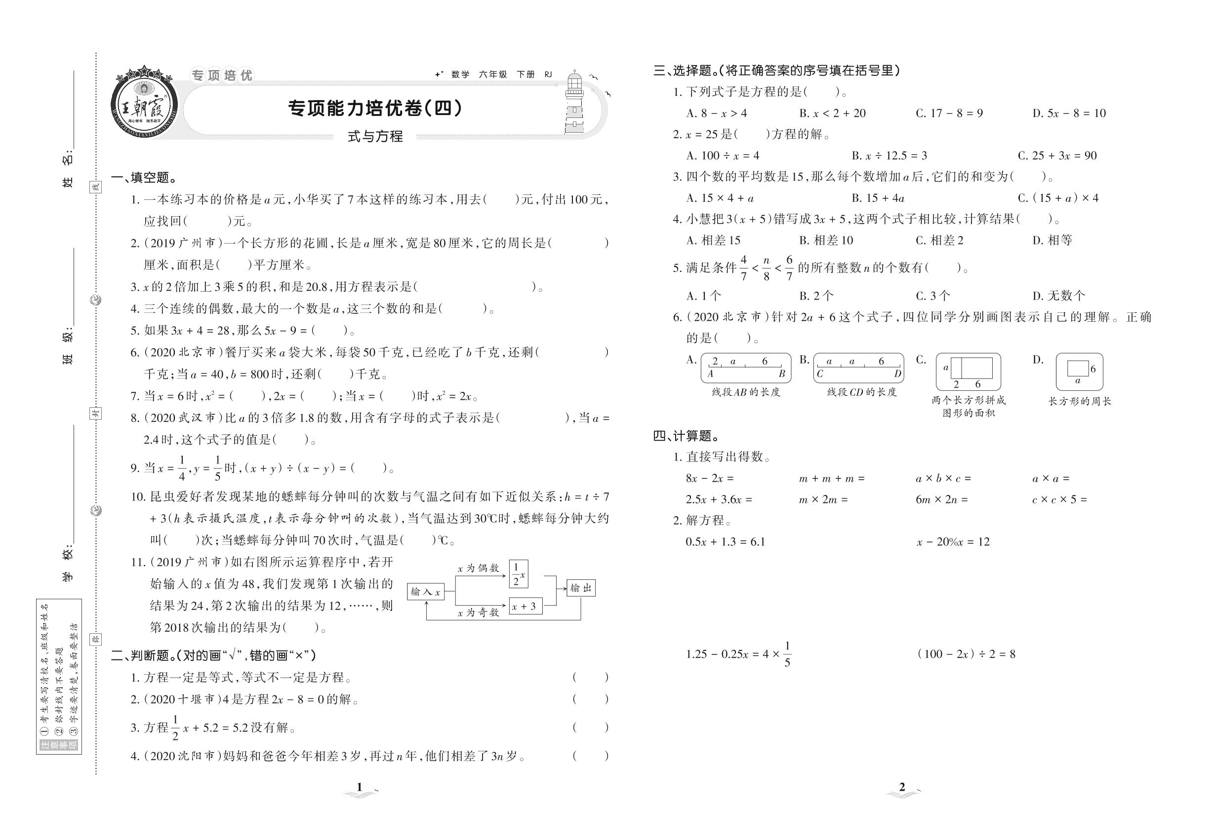 2021下册六年级数学人教版 专项能力培优卷(四) 式与方程