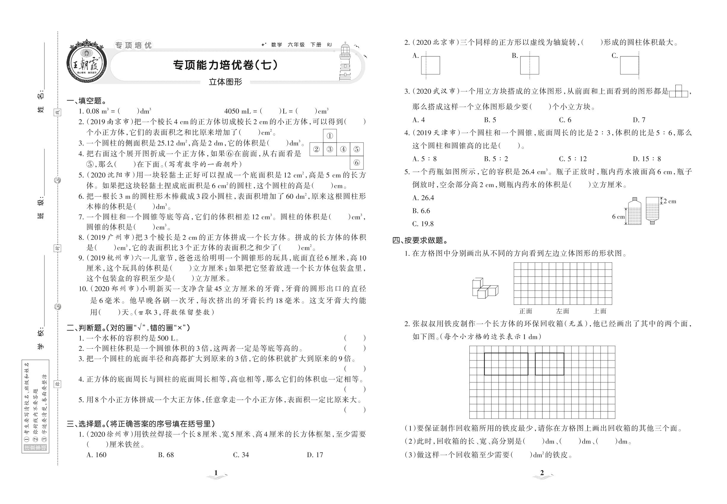2021下册六年级数学人教版 专项能力培优卷(七) 立体图形