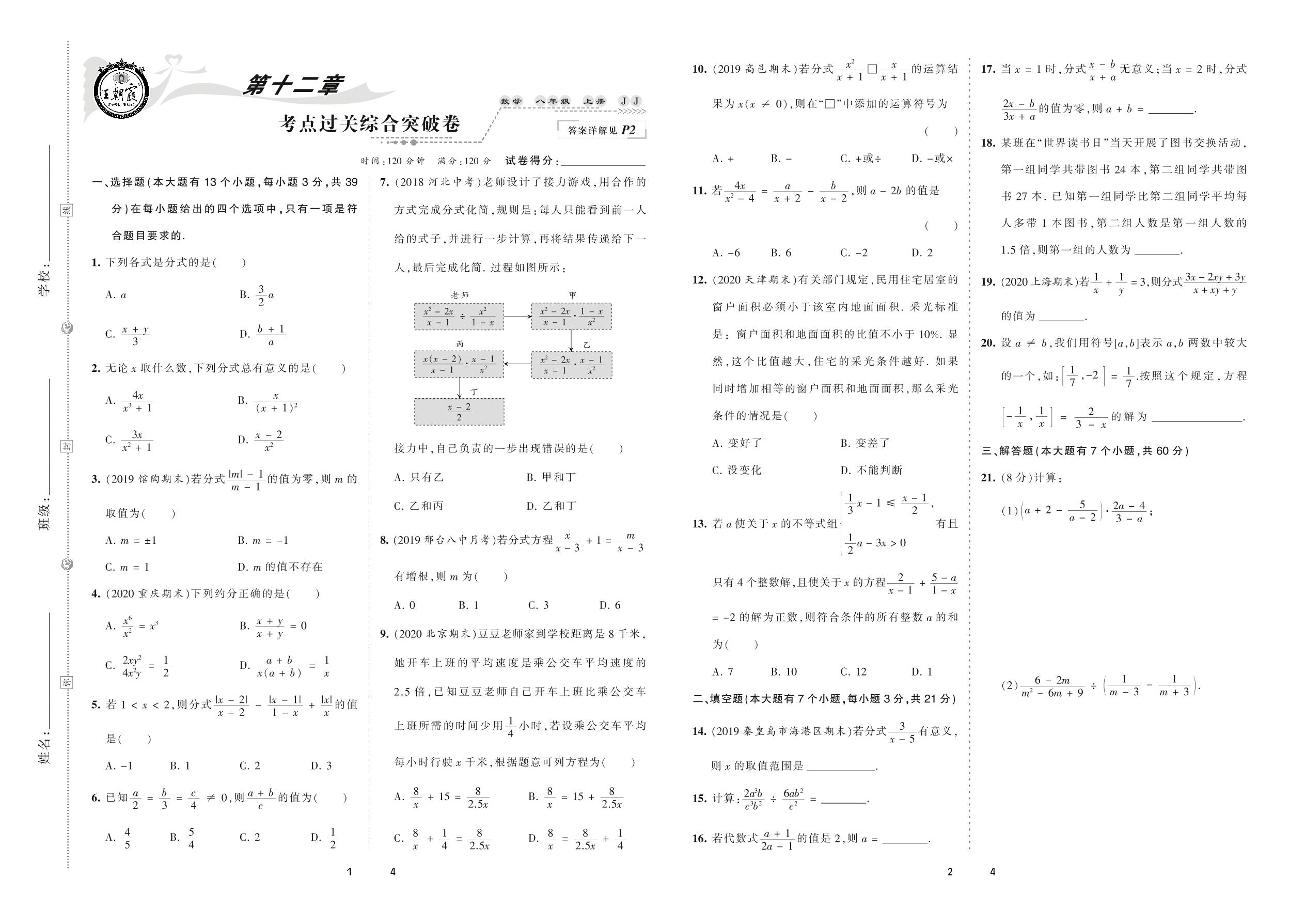 2020上册八年级数学冀教版 第十二章 考点过关综合突破卷