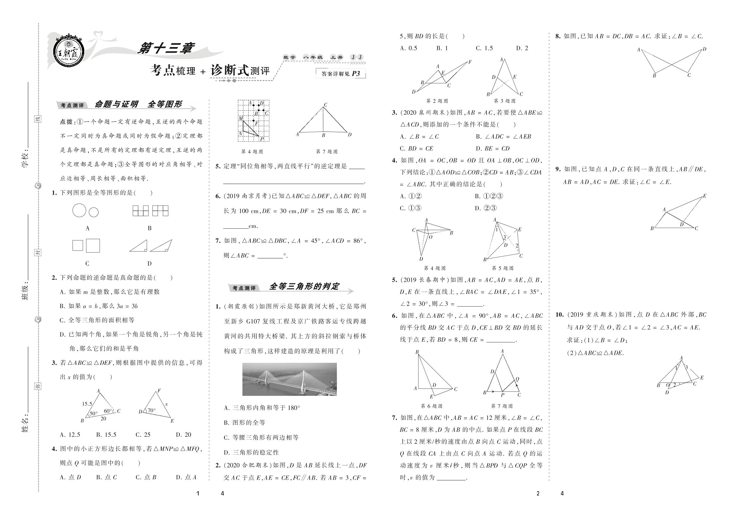 2020上册八年级数学冀教版 第十三章 考点梳理 + 诊断式测评