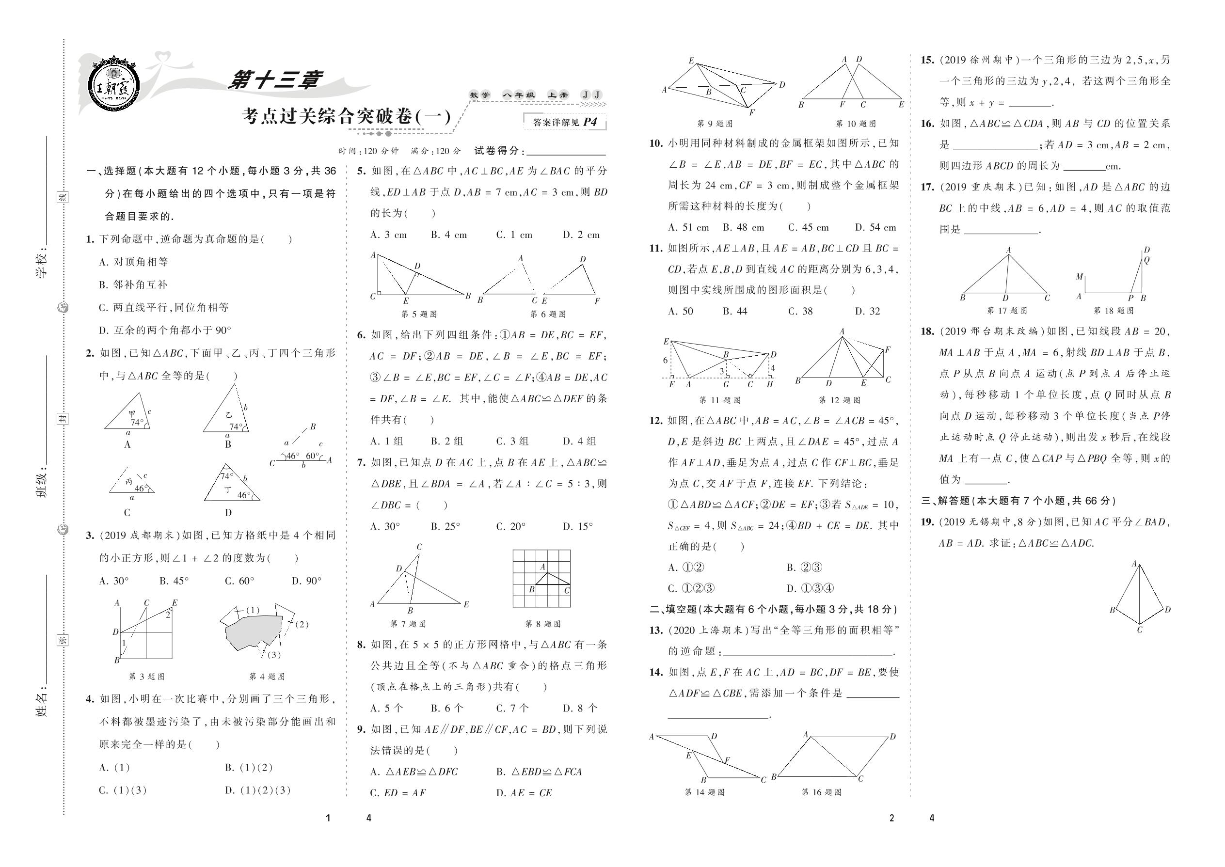 2020上册八年级数学冀教版 第十三章 考点过关综合突破卷(一)