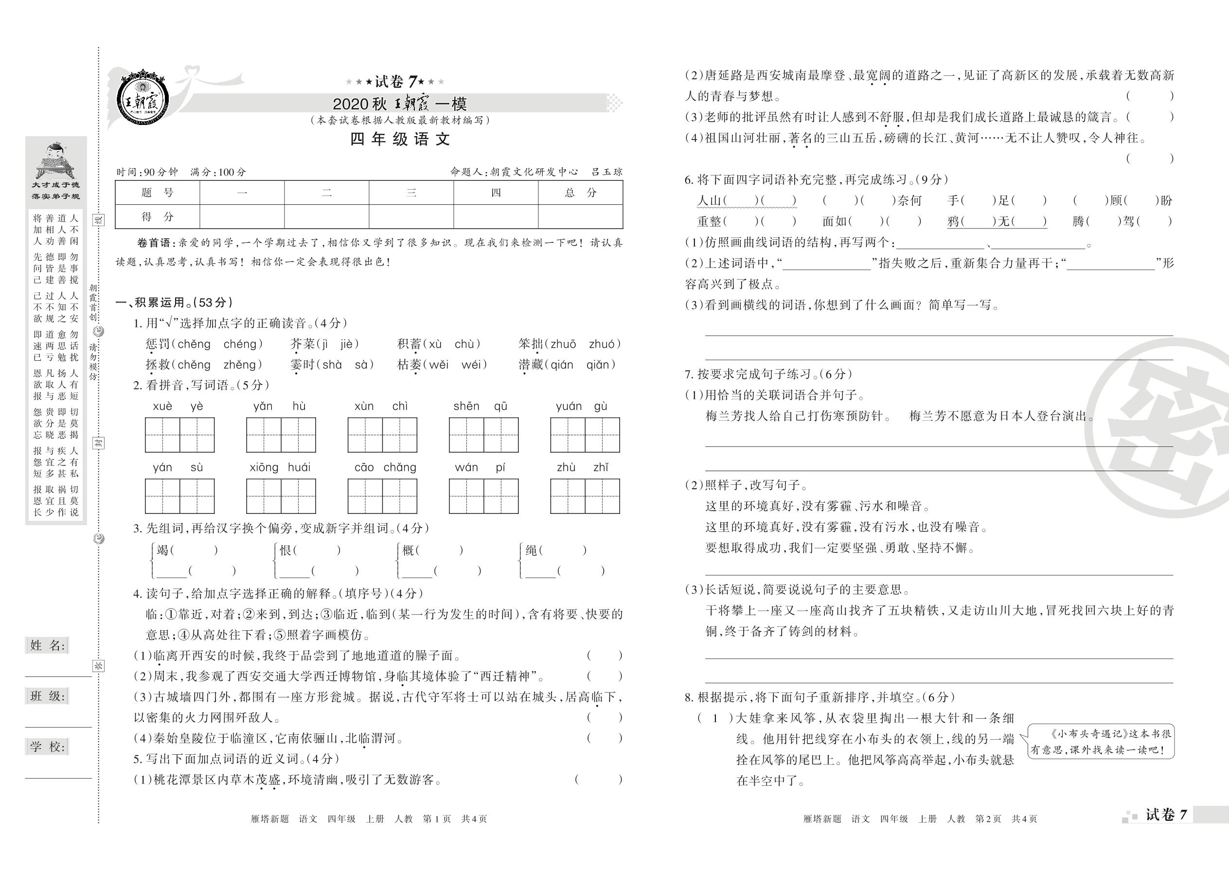王朝霞期末模拟卷四年级上册语文(人教版)_R210801183846【7】