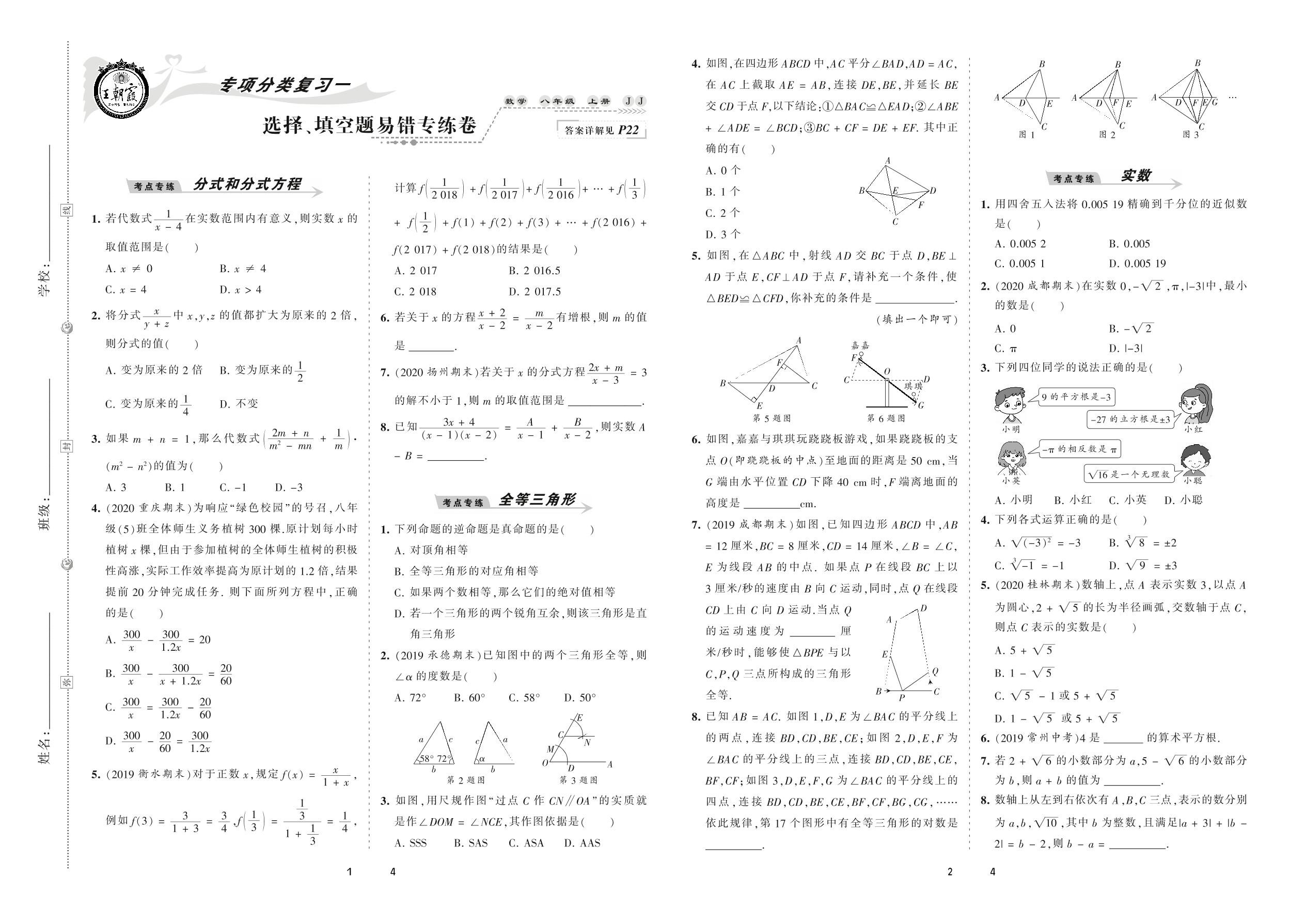 2020上册八年级数学冀教版 选择、填空题易错专练卷