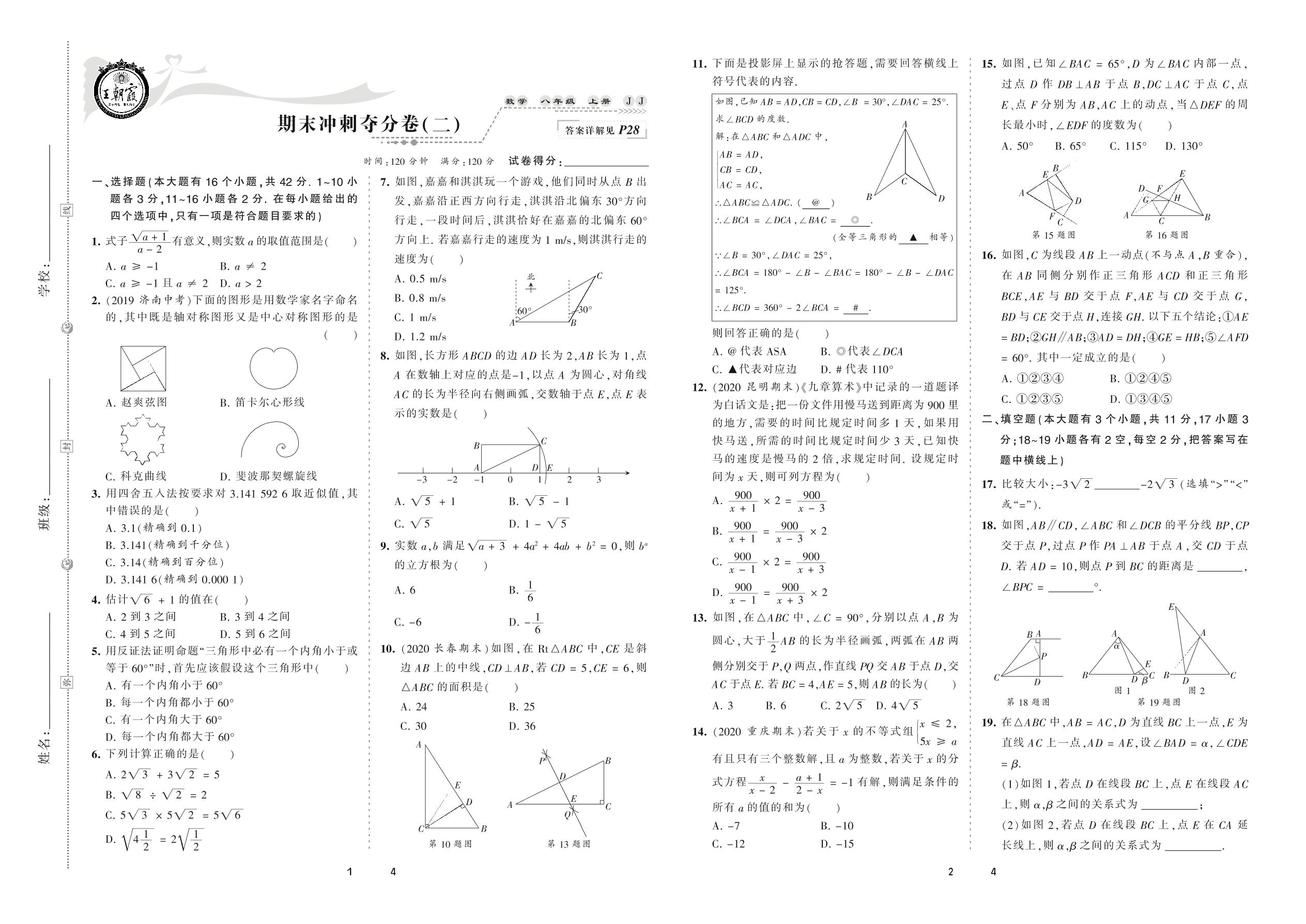 2020上册八年级数学冀教版 期末冲刺夺分卷(二)