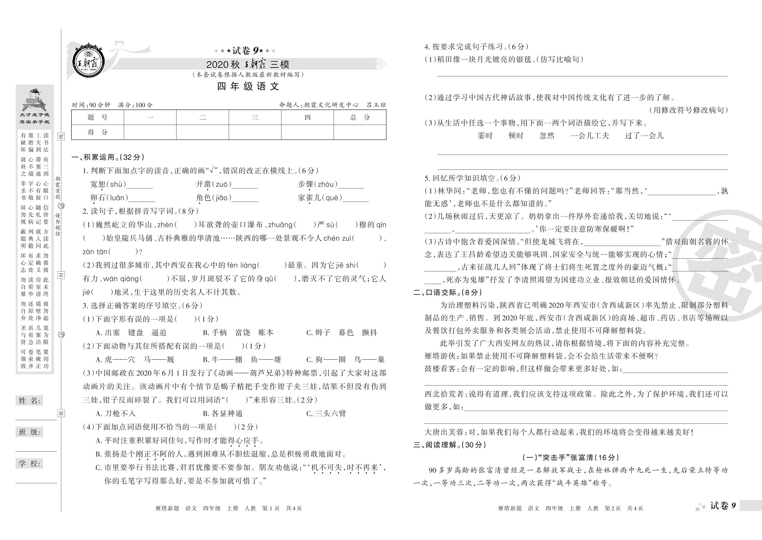 王朝霞期末模拟卷四年级上册语文(人教版)_R210801183858【9】