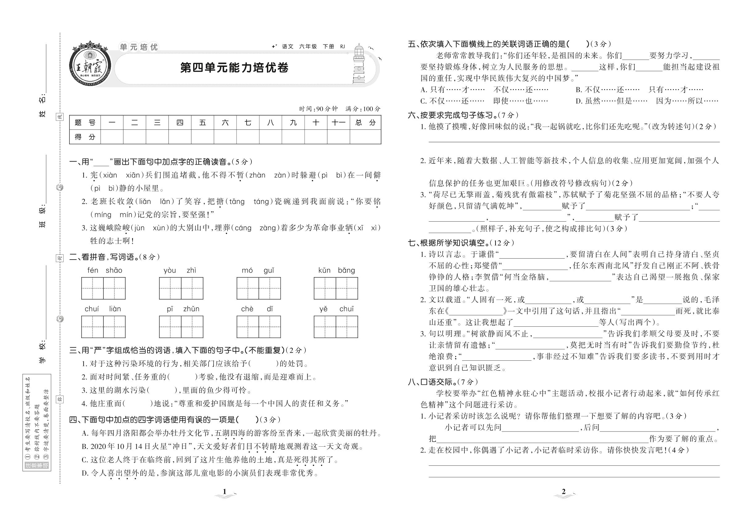 2021下册六年级语文人教版 第四单元 能力培优卷