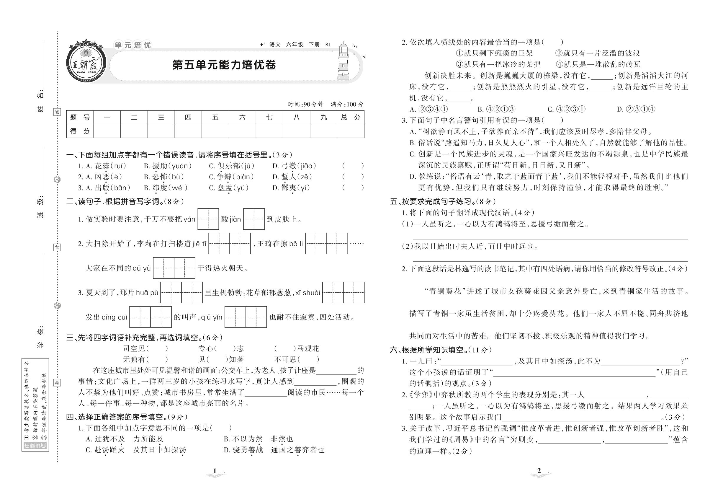 2021下册六年级语文人教版 第五单元 能力培优卷