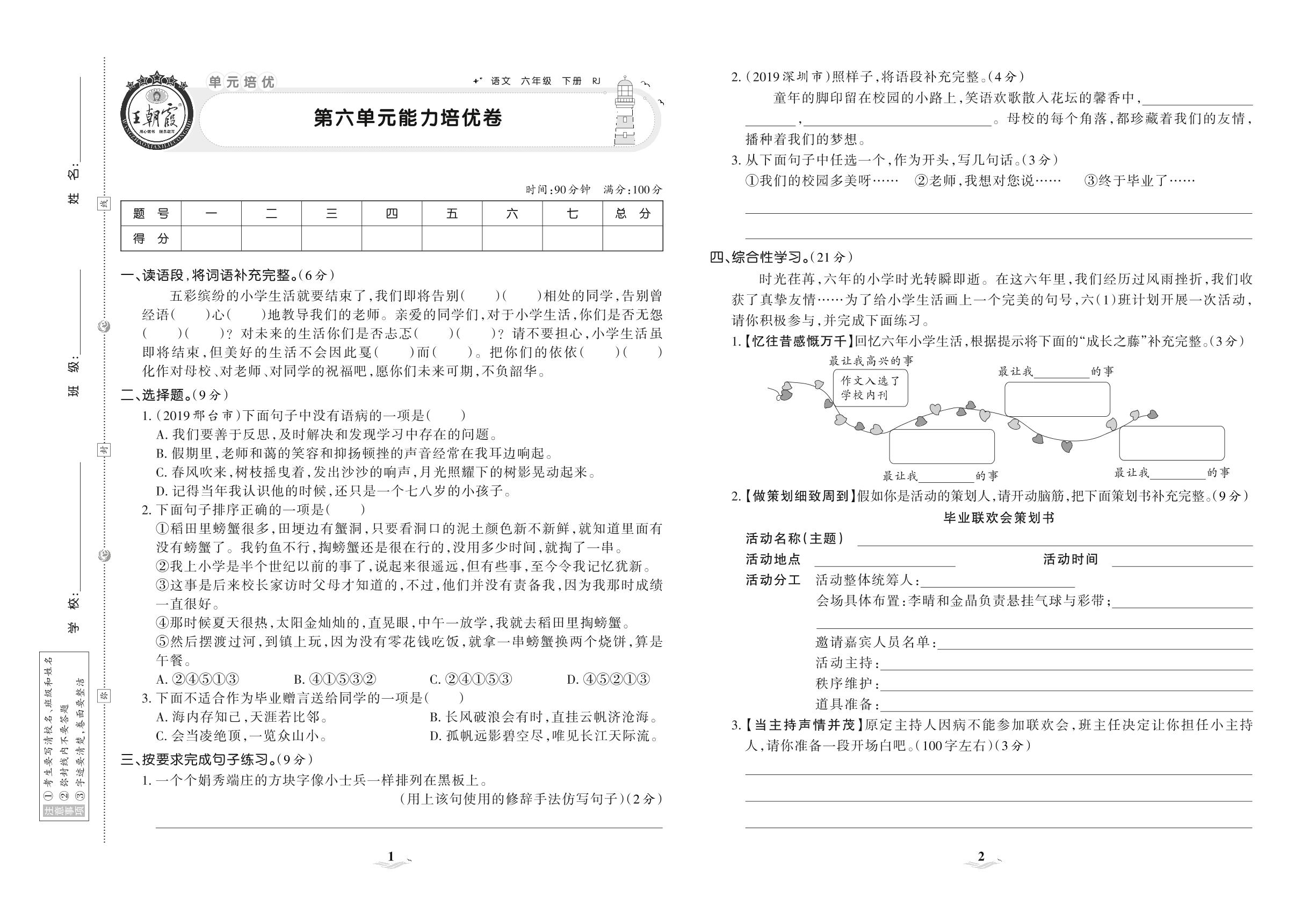 2021下册六年级语文人教版 第六单元 能力培优卷