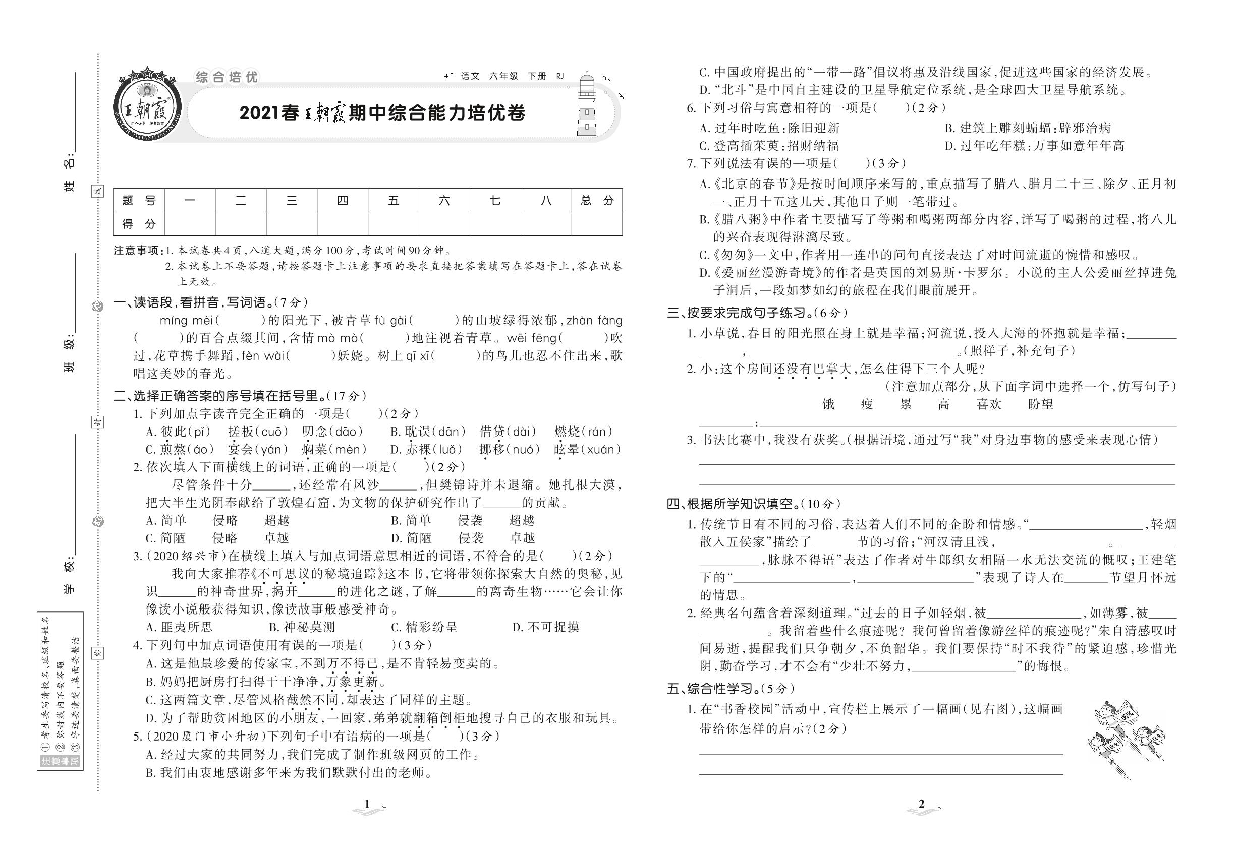 2021下册六年级语文人教版 王朝霞期中综合能力培优卷