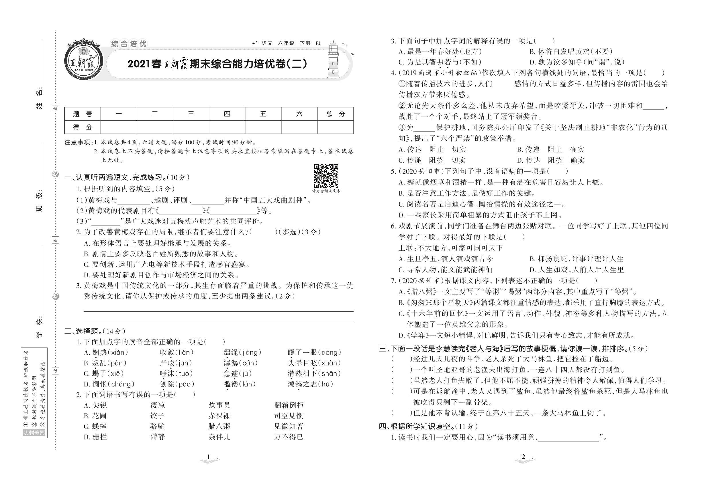 2021下册六年级语文人教版 王朝霞期末综合能力培优卷(二)