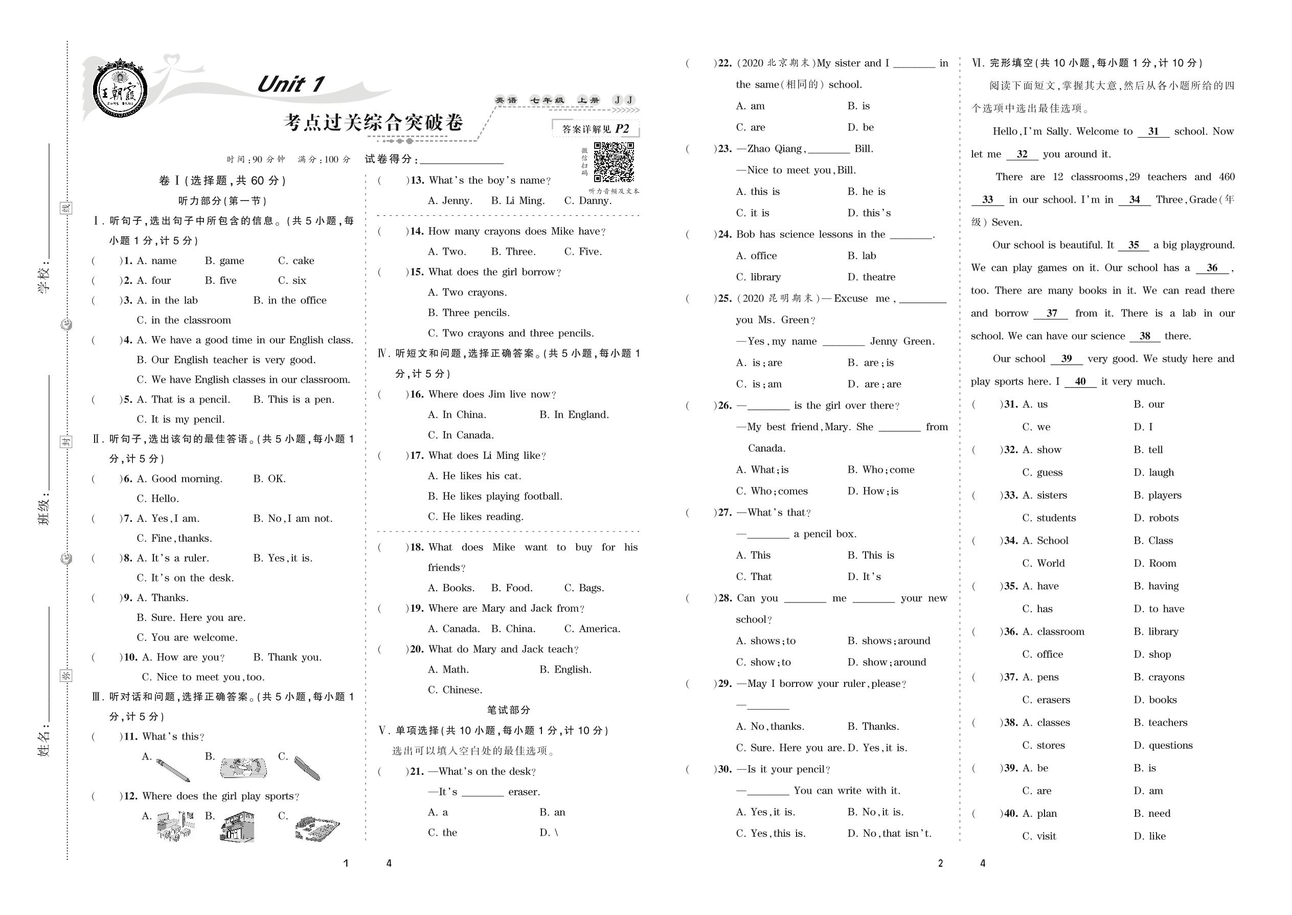 2020上册七年级英语冀教版 Unit 1 考点过关综合突破卷