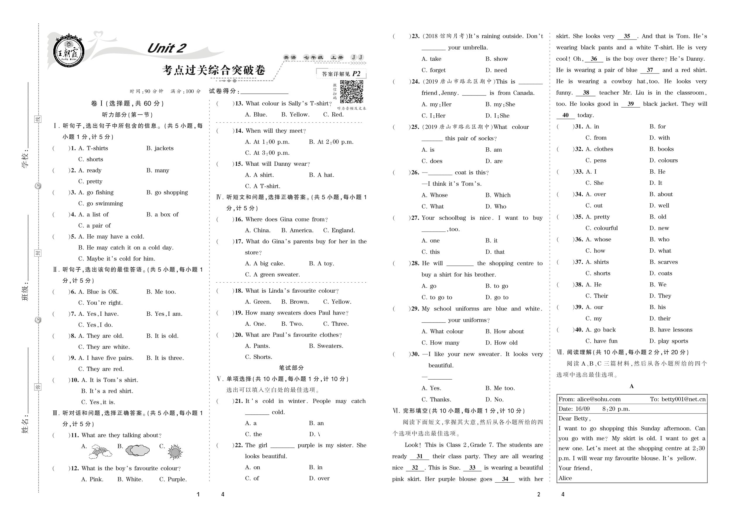 2020上册七年级英语冀教版 Unit 2 考点过关综合突破卷