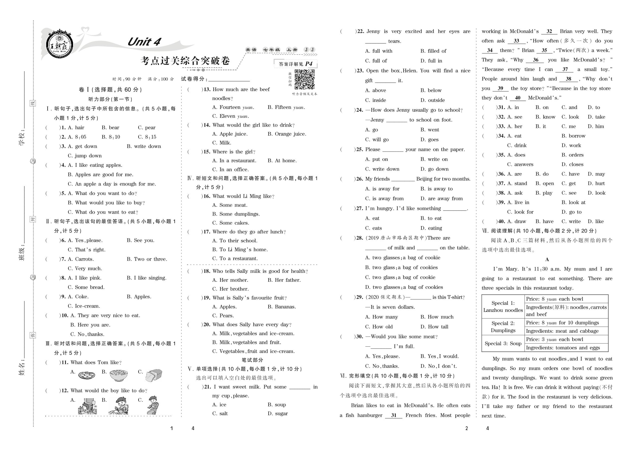 2020上册七年级英语冀教版 Unit 4 考点过关综合突破卷