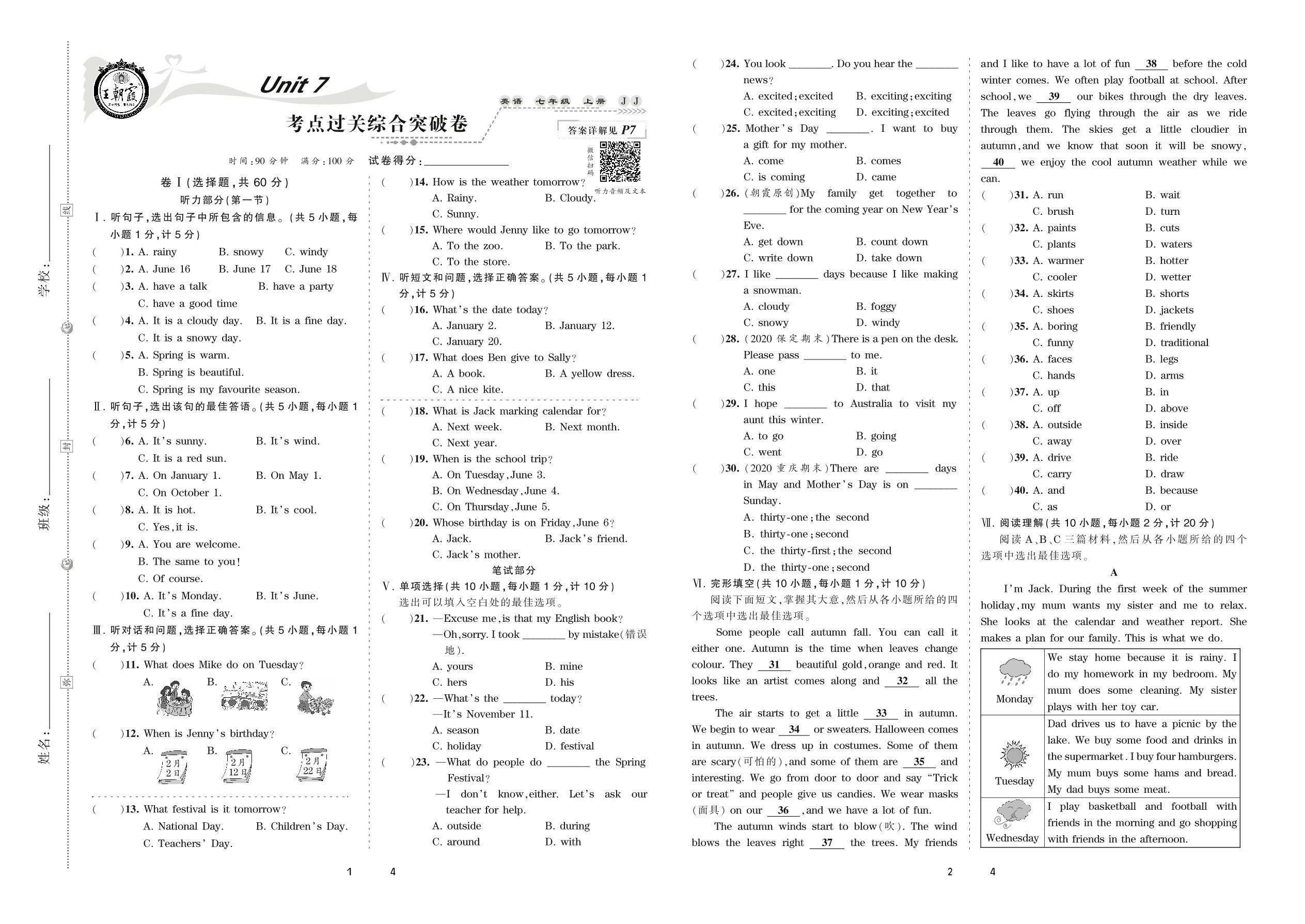 2020上册七年级英语冀教版 Unit 7 考点过关综合突破卷