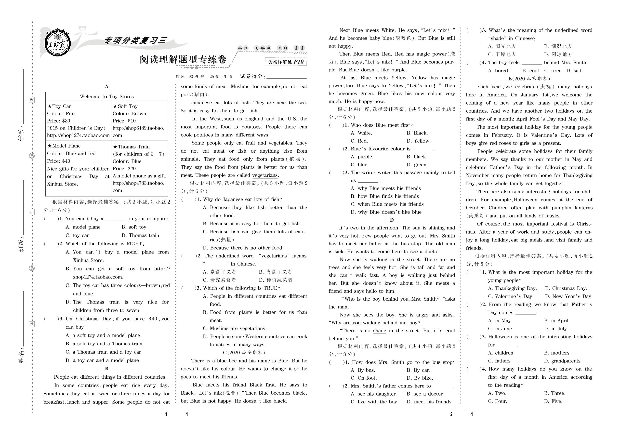 2020上册七年级英语冀教版 阅读理解题型专练卷