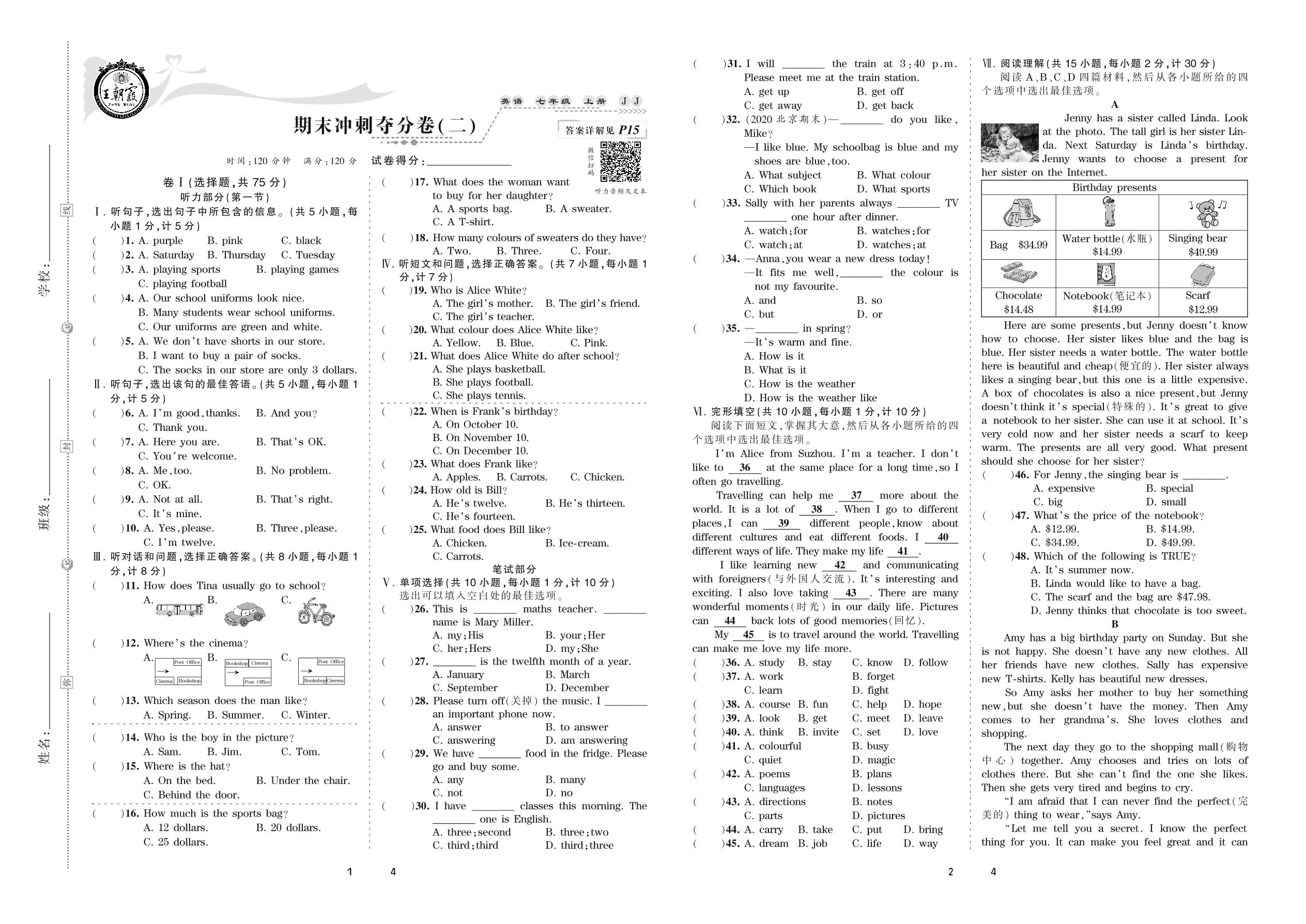 2020上册七年级英语冀教版 期末冲刺夺分卷(二)