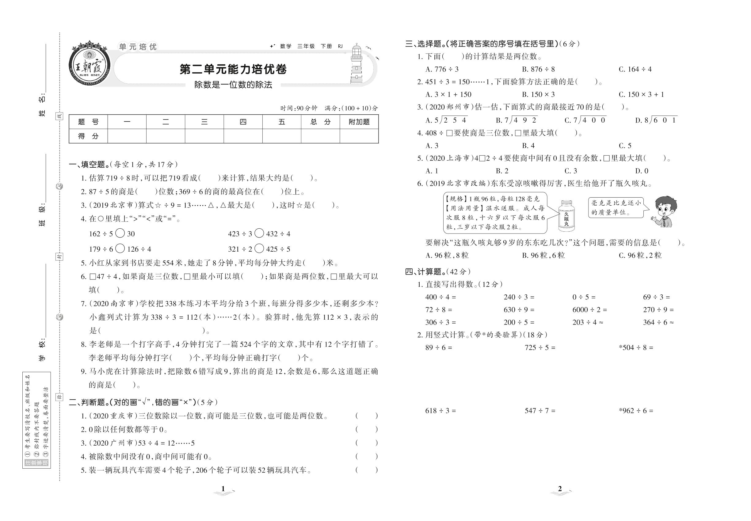 2021下册三年级数学人教版 第二单元 能力培优卷