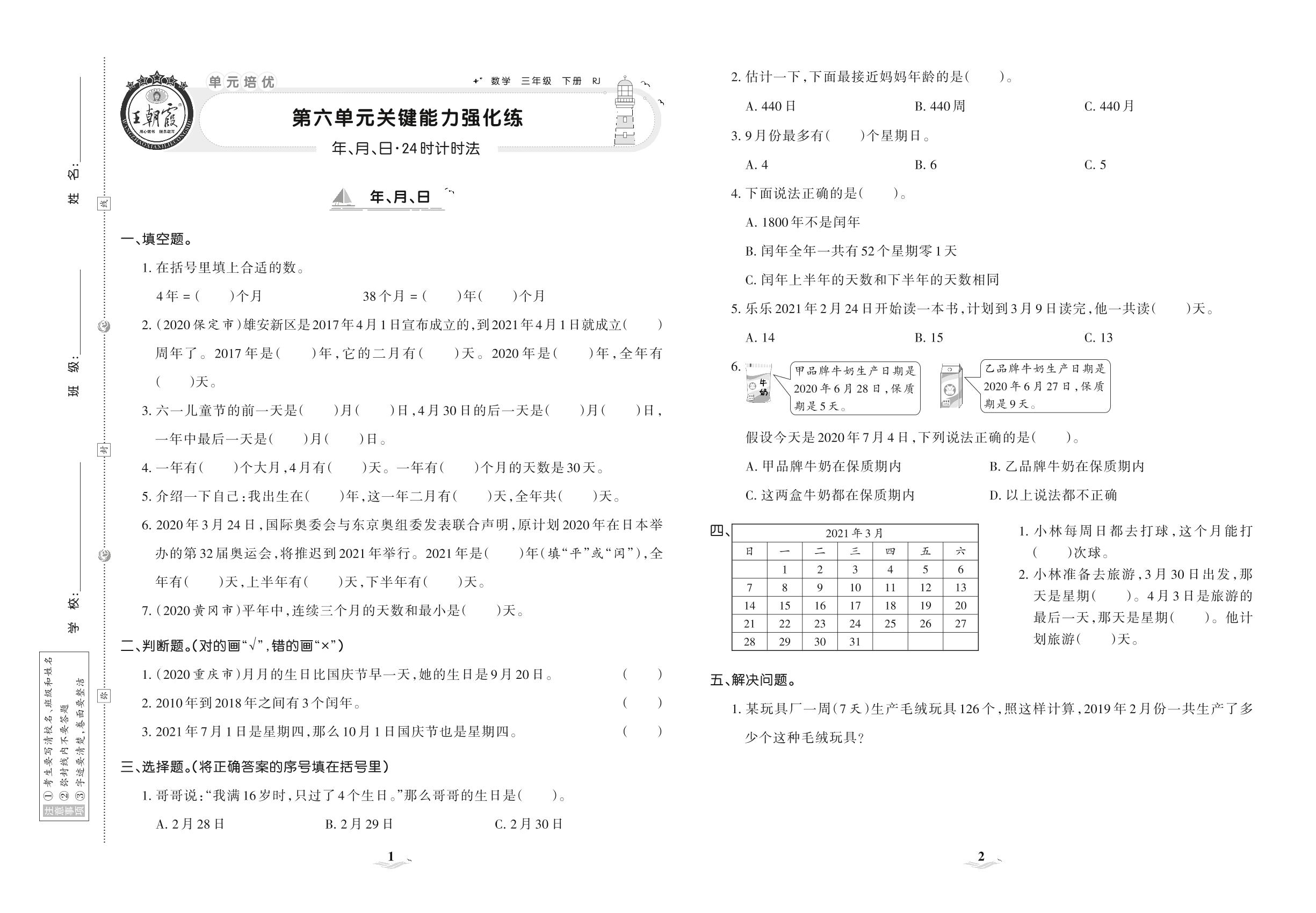 2021下册三年级数学人教版 第六单元 关键能力强化练