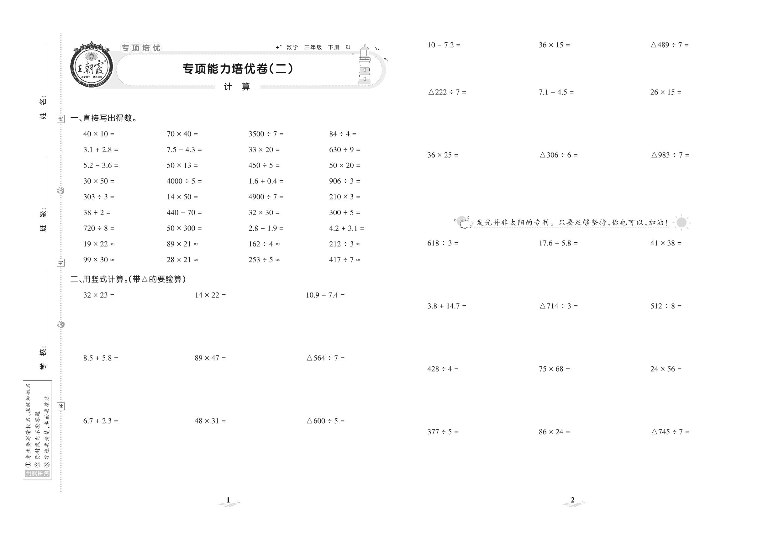 2021下册三年级数学人教版 专项能力培优卷(二) 计算