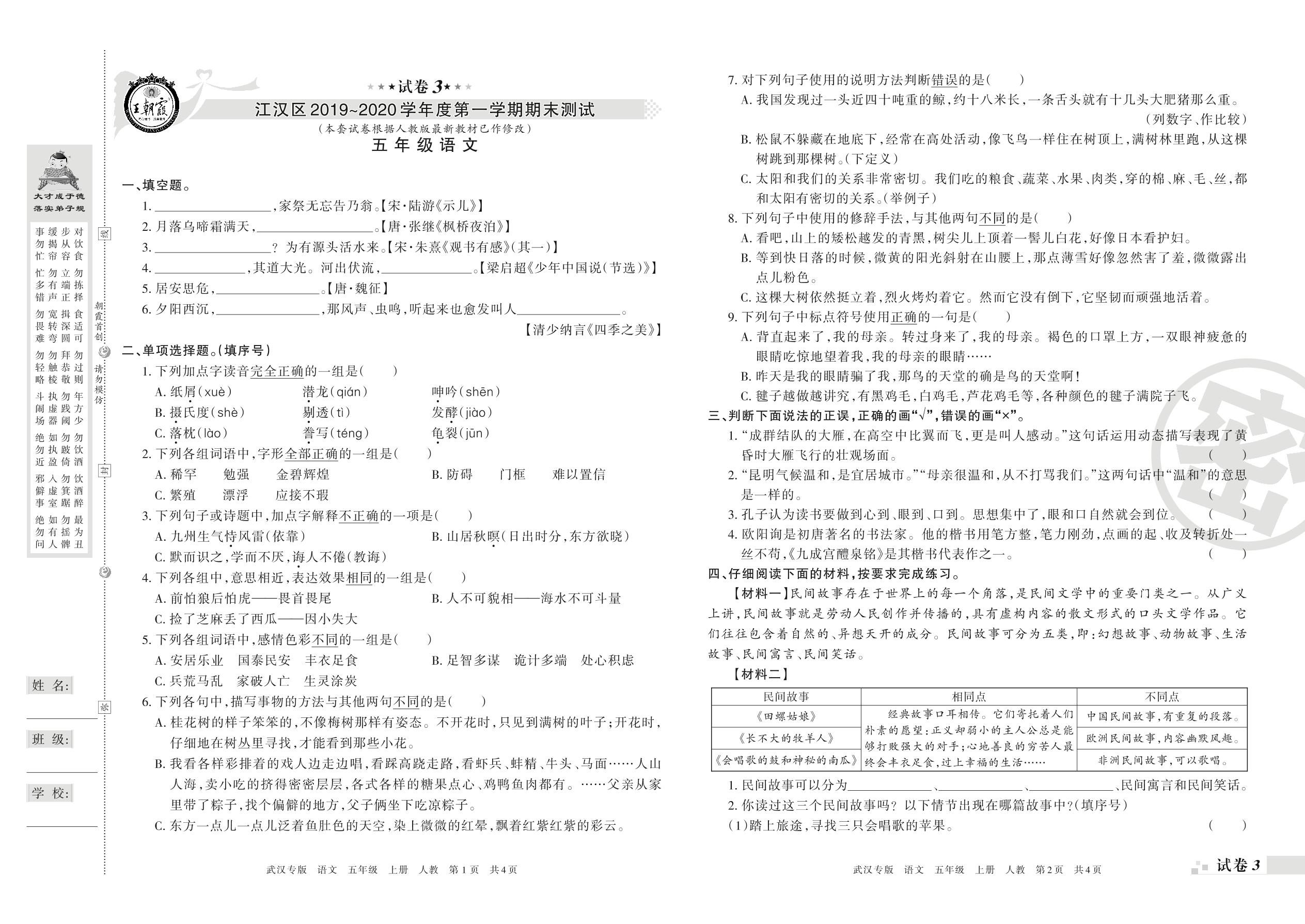 2019-2020学年第一学期武汉市江汉区五年级语文试卷(人教版)【3】