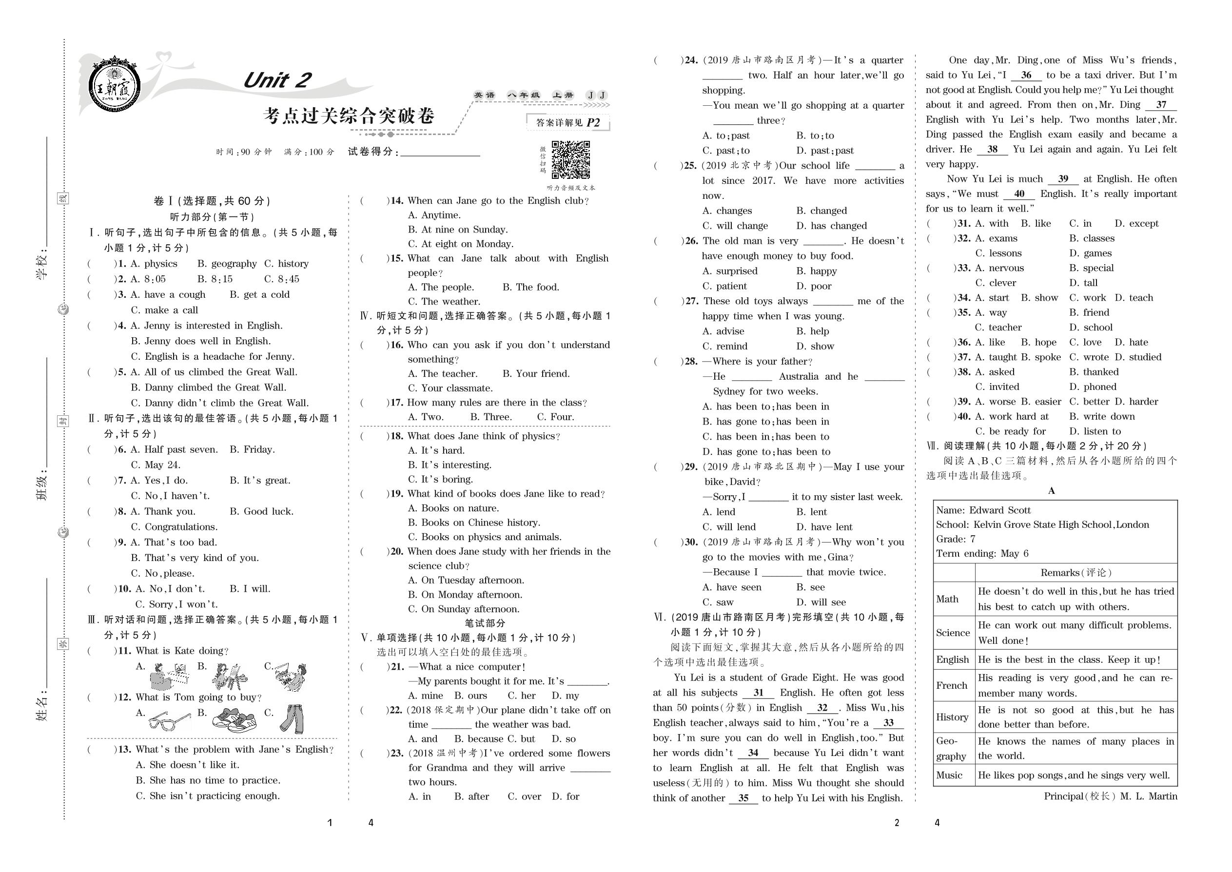 2020上册八年级英语冀教版 Unit 2 考点过关综合突破卷