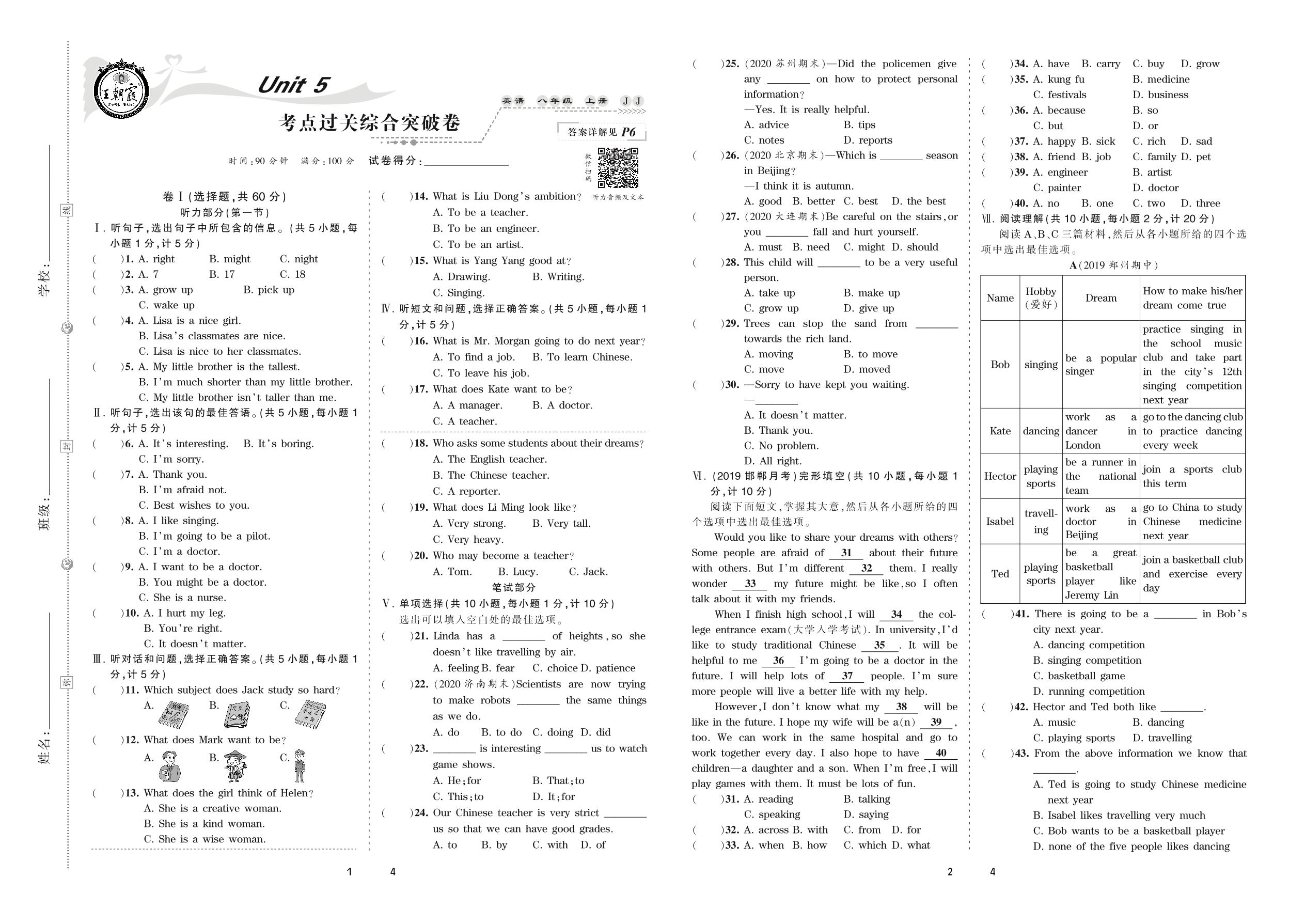 2020上册八年级英语冀教版 Unit 5 考点过关综合突破卷