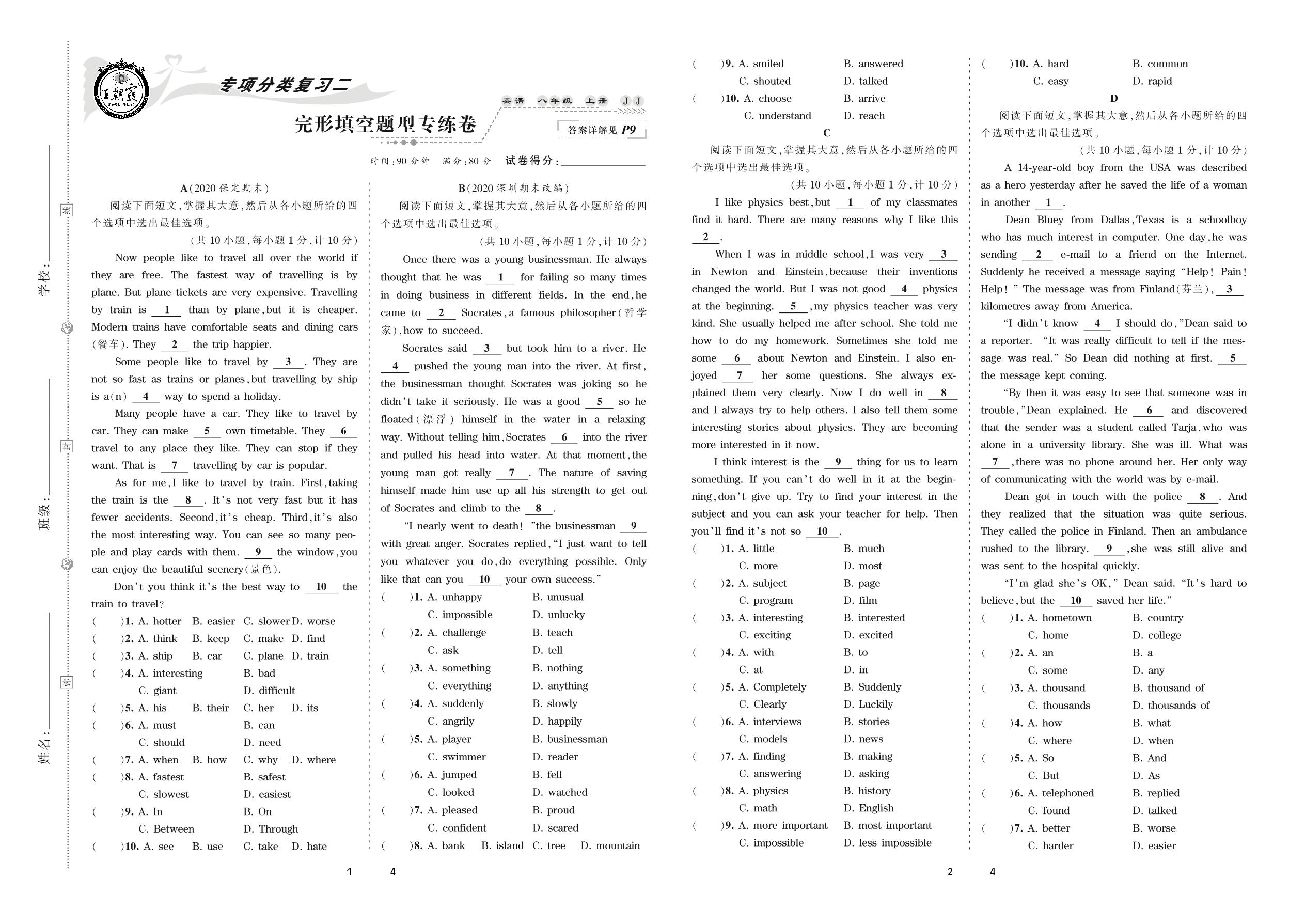 2020上册八年级英语冀教版 完形填空题型专练卷