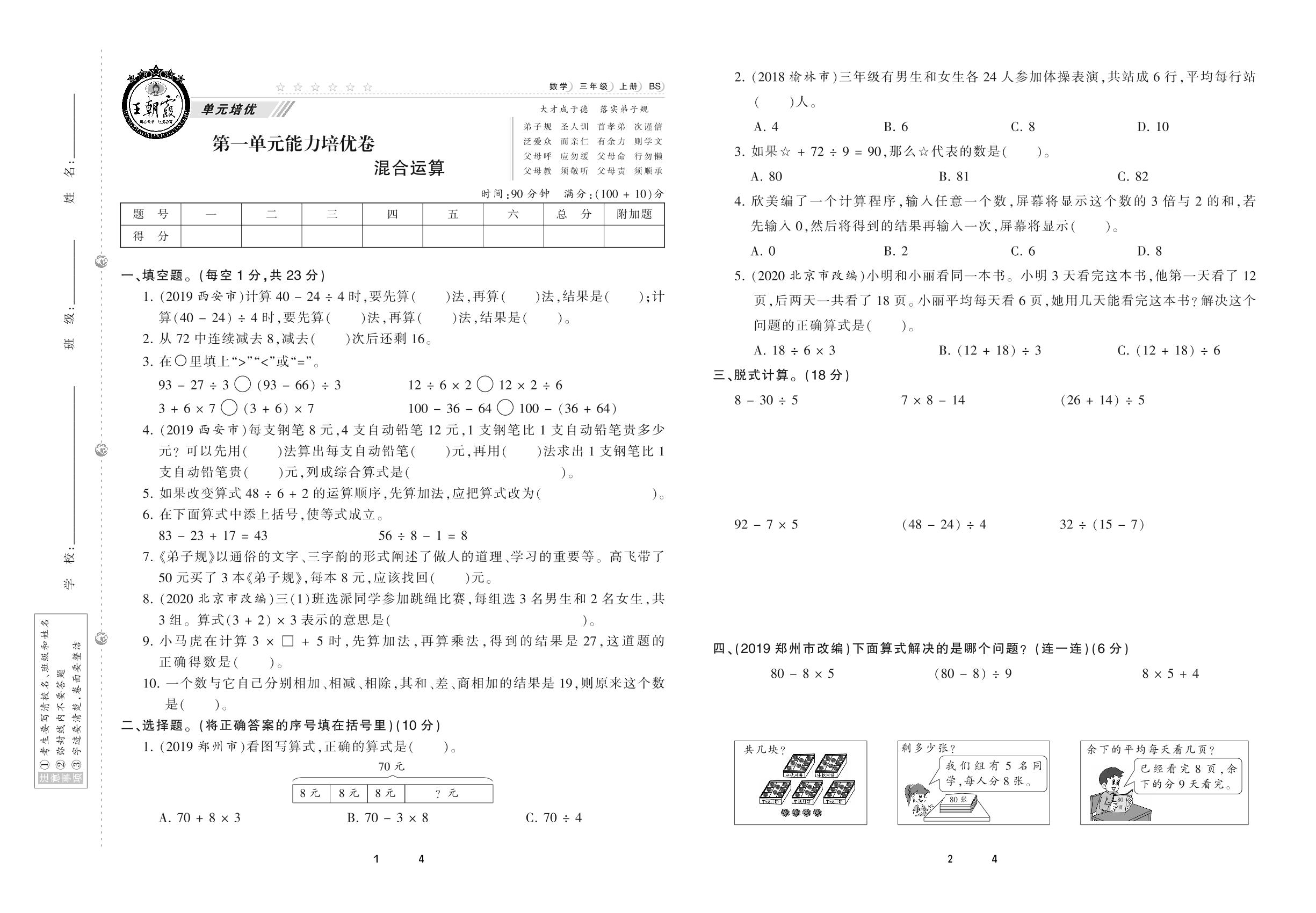 2020上册三年级数学北师版 第一单元 能力培优卷