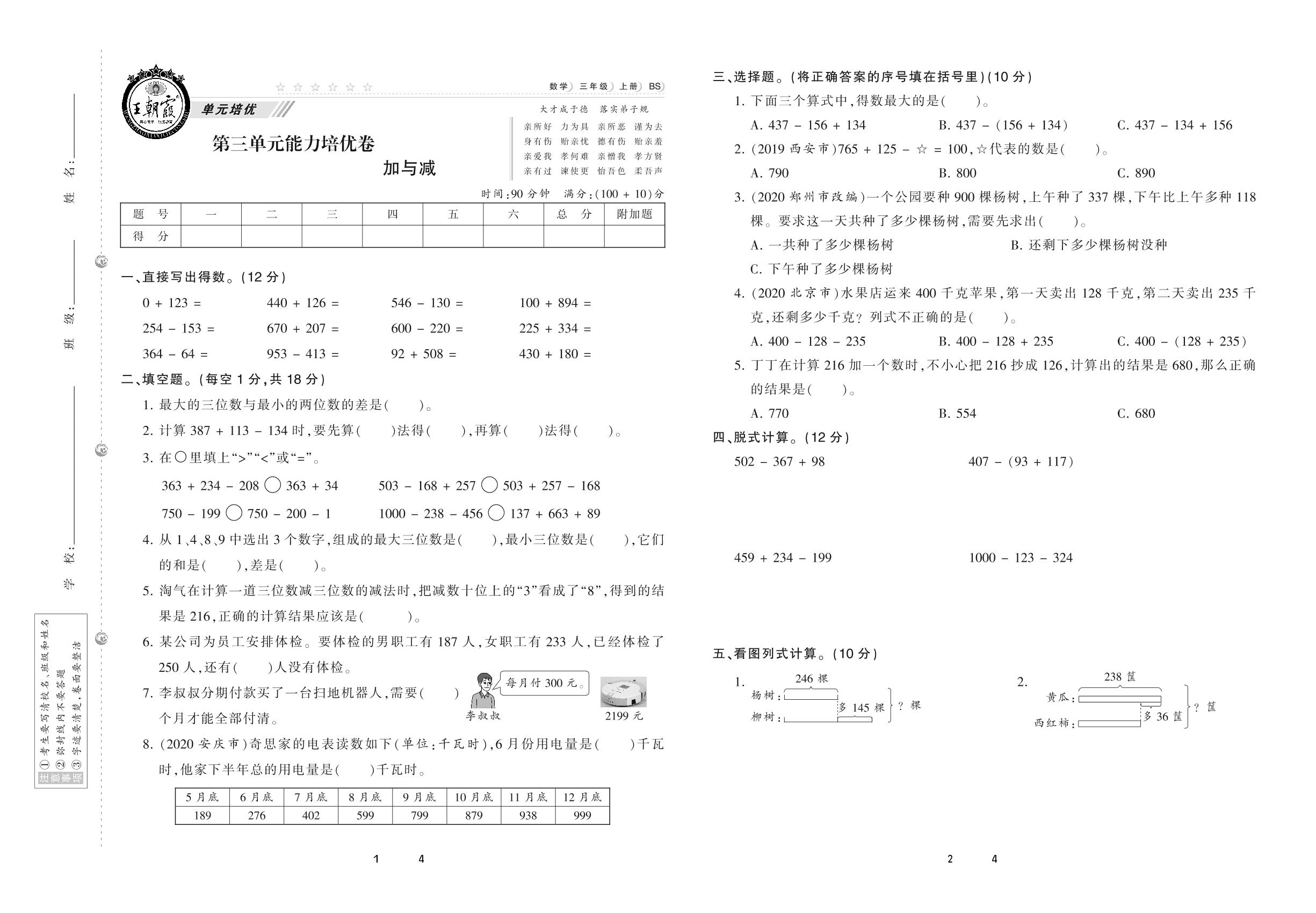 2020上册三年级数学北师版 第三单元 能力培优卷