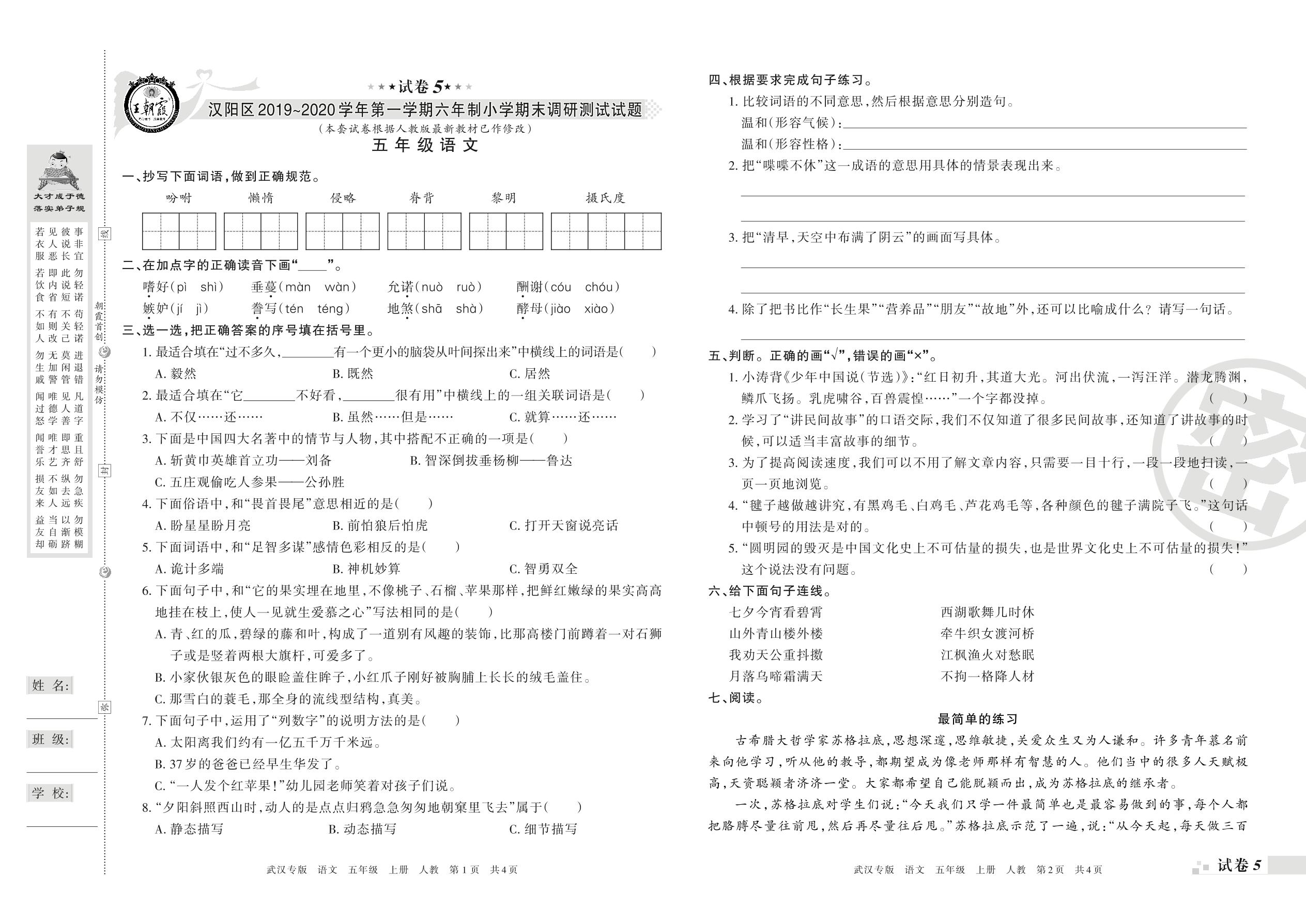 2019-2020学年第一学期武汉市汉阳区五年级语文试卷(人教版)【5】