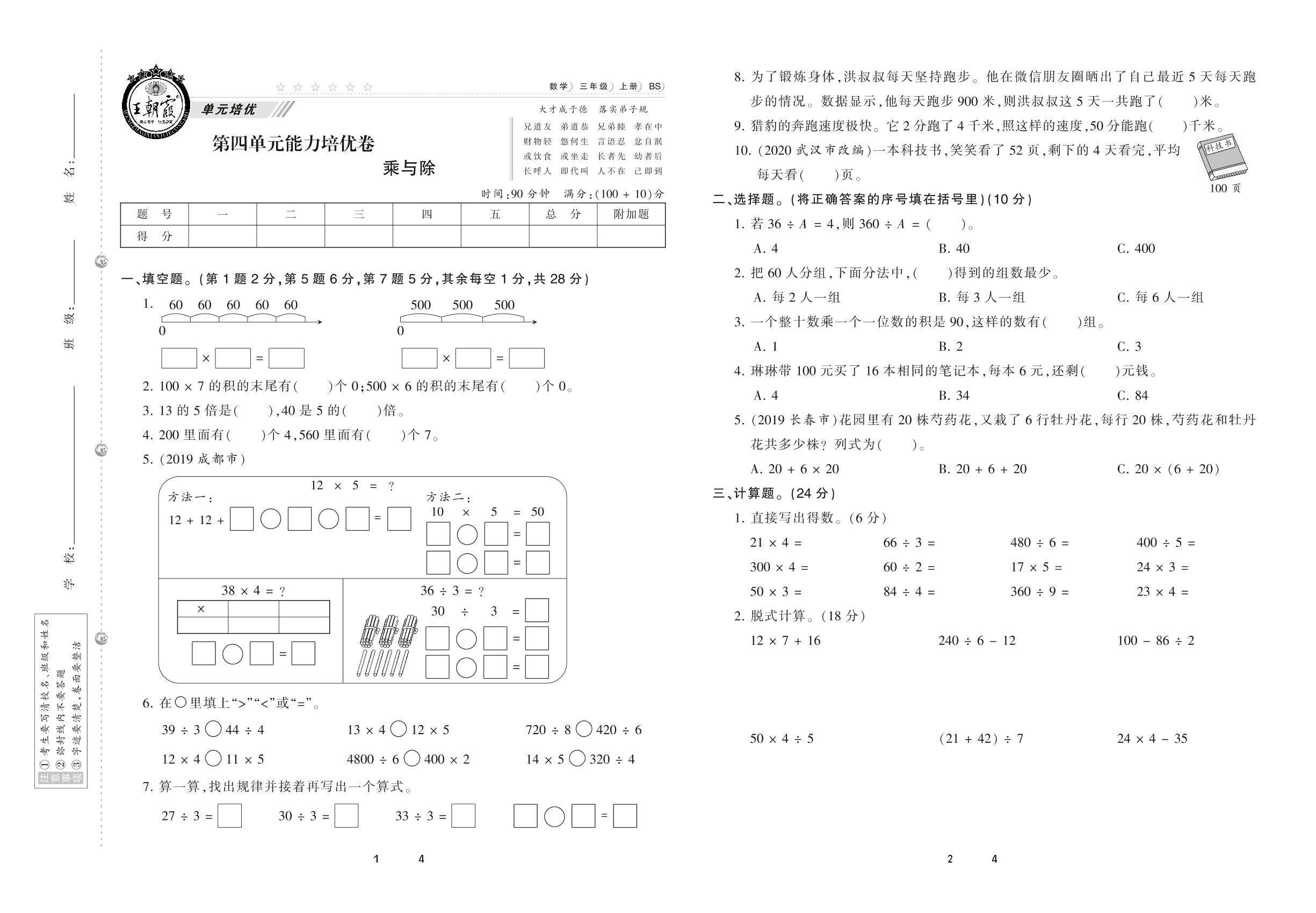 2020上册三年级数学北师版 第四单元 能力培优卷